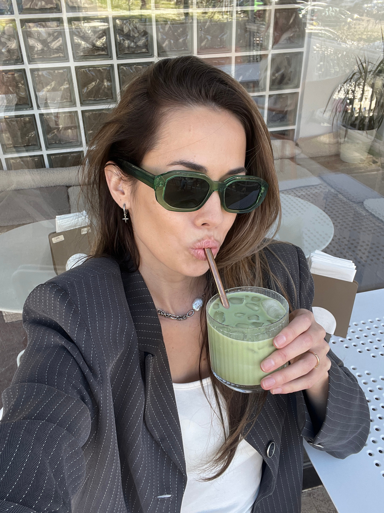 A medium-close-up photograph shows a woman seated at an outdoor cafe drinking a beverage, possibly a matcha latte, through a straw. She wears dark green sunglasses and a gray pinstripe blazer over a w…read more