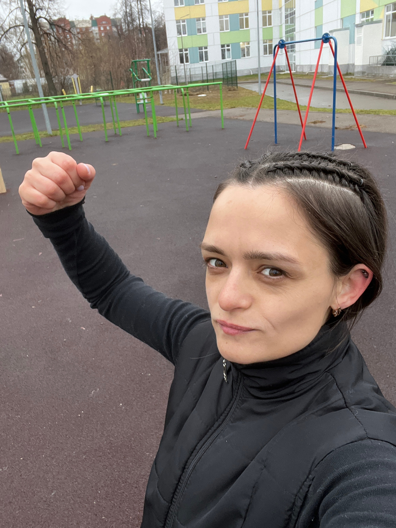A young woman is taking a selfie outdoors. She has dark hair braided on the sides and is wearing a black puffer vest and a black long-sleeved shirt. She is holding her fist up in front of the camera.…read more