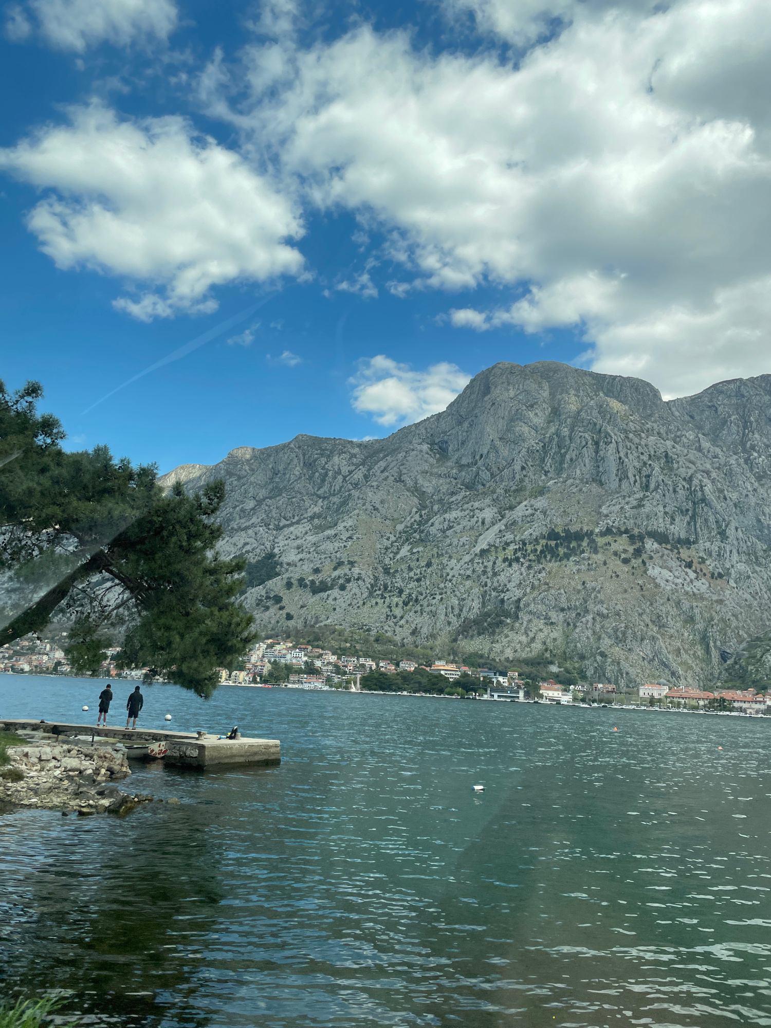 The image shows a coastal scene in Škaljari, Montenegro. In the foreground, two people stand on a rocky bank near the water's edge. Behind them, a concrete pier extends into the water where a person i…read more