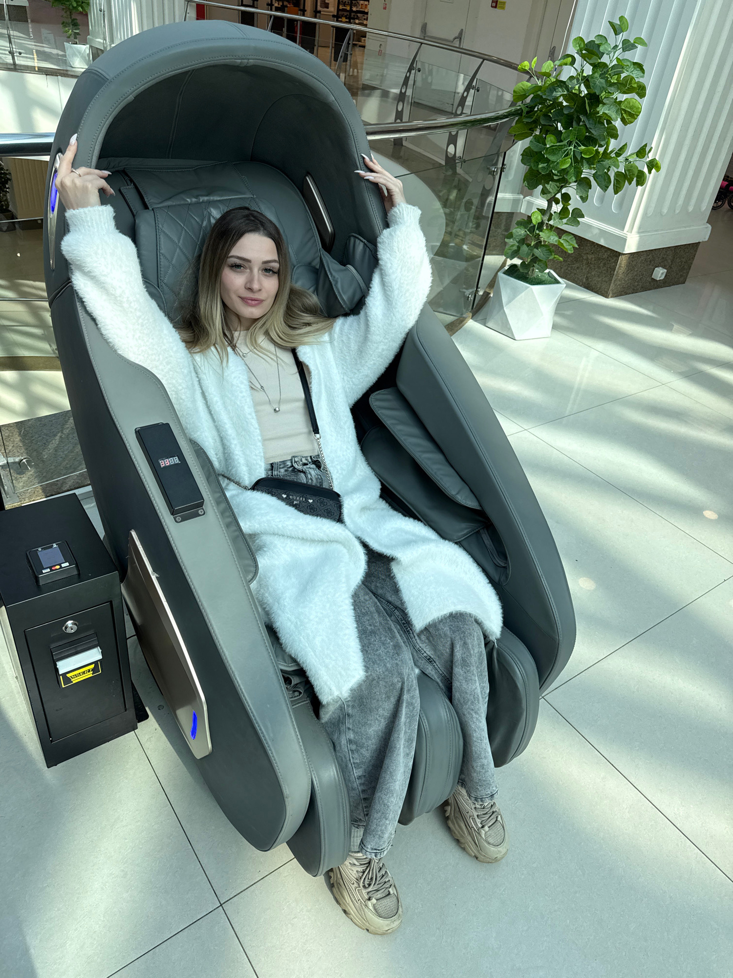 A young adult female is seated in a dark grey, capsule-style massage chair within a brightly lit commercial interior, identified as Reutov, Russia. She wears a light-colored, fluffy cardigan over a be…read more