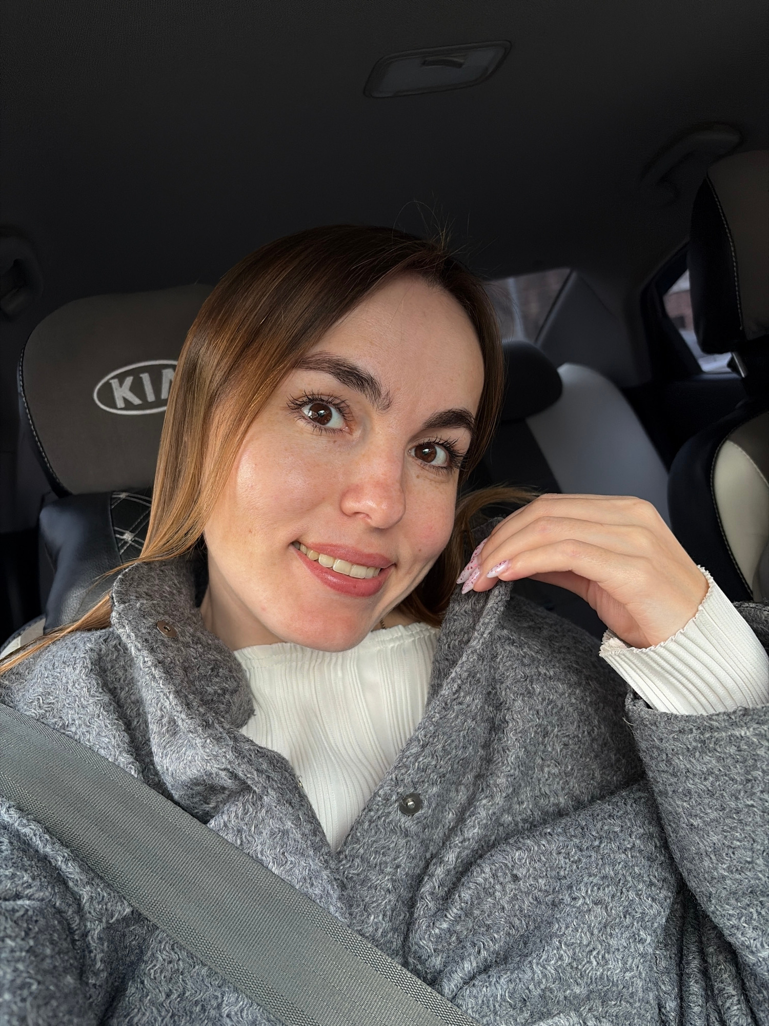 A woman is in the driver's seat of a Kia car, wearing a gray coat and white sweater, and smiling. The car's headrest is visible and has the Kia logo on it. She's wearing a seatbelt. The photo appears…read more