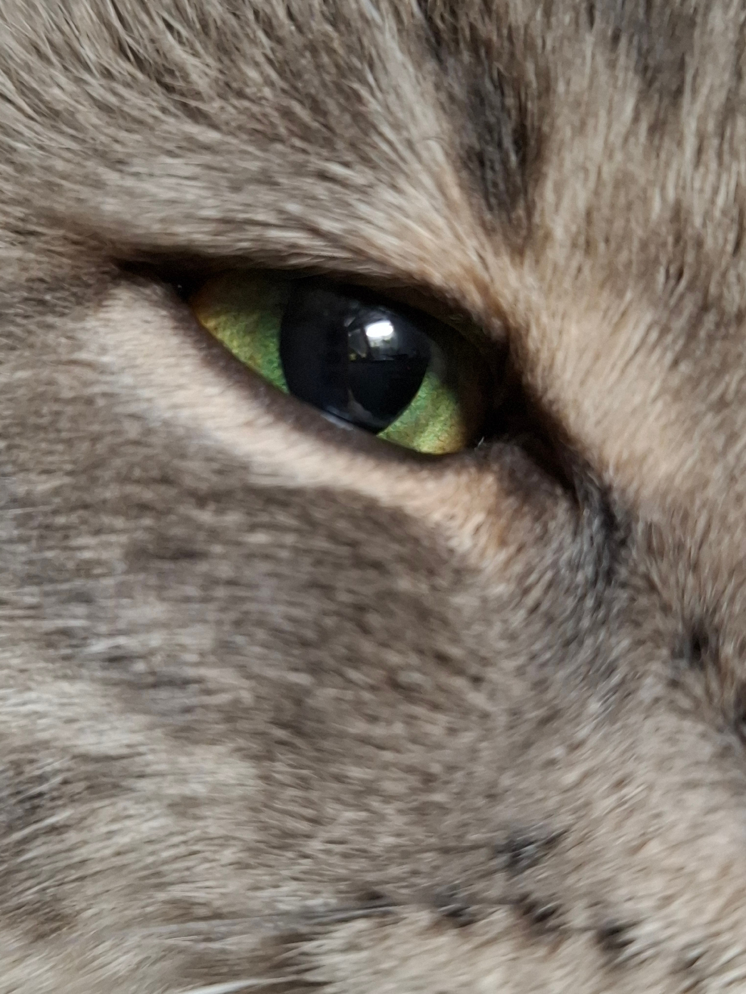 The image is a close-up of an animal's eye, likely a cat or a similar feline. The eye is green with a black pupil. Fur surrounds the eye; the fur is gray and brown in color. The location is unknown an…read more