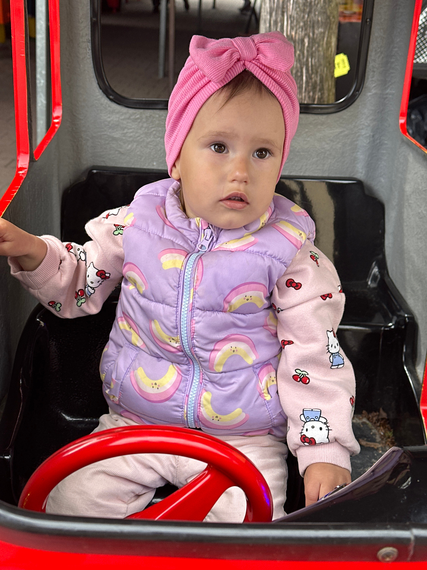 A baby is seated inside a toy vehicle, likely in a recreational or playground area. The baby wears a pink headband, a light pink long-sleeved shirt with Hello Kitty and cherry motifs, and a lavender p…read more