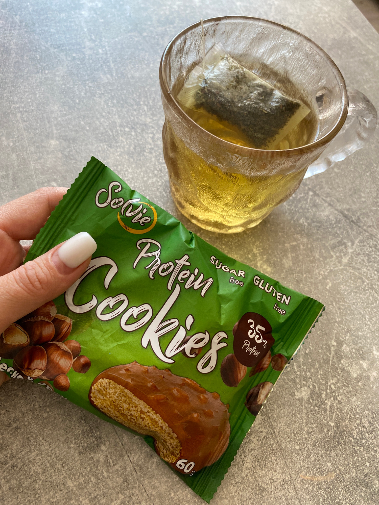A photograph depicts a still life scene featuring a cup of tea and a package of "Solvie" Protein Cookies. The tea is in a clear glass mug with a tea bag steeping in the golden liquid. The cookie packa…read more