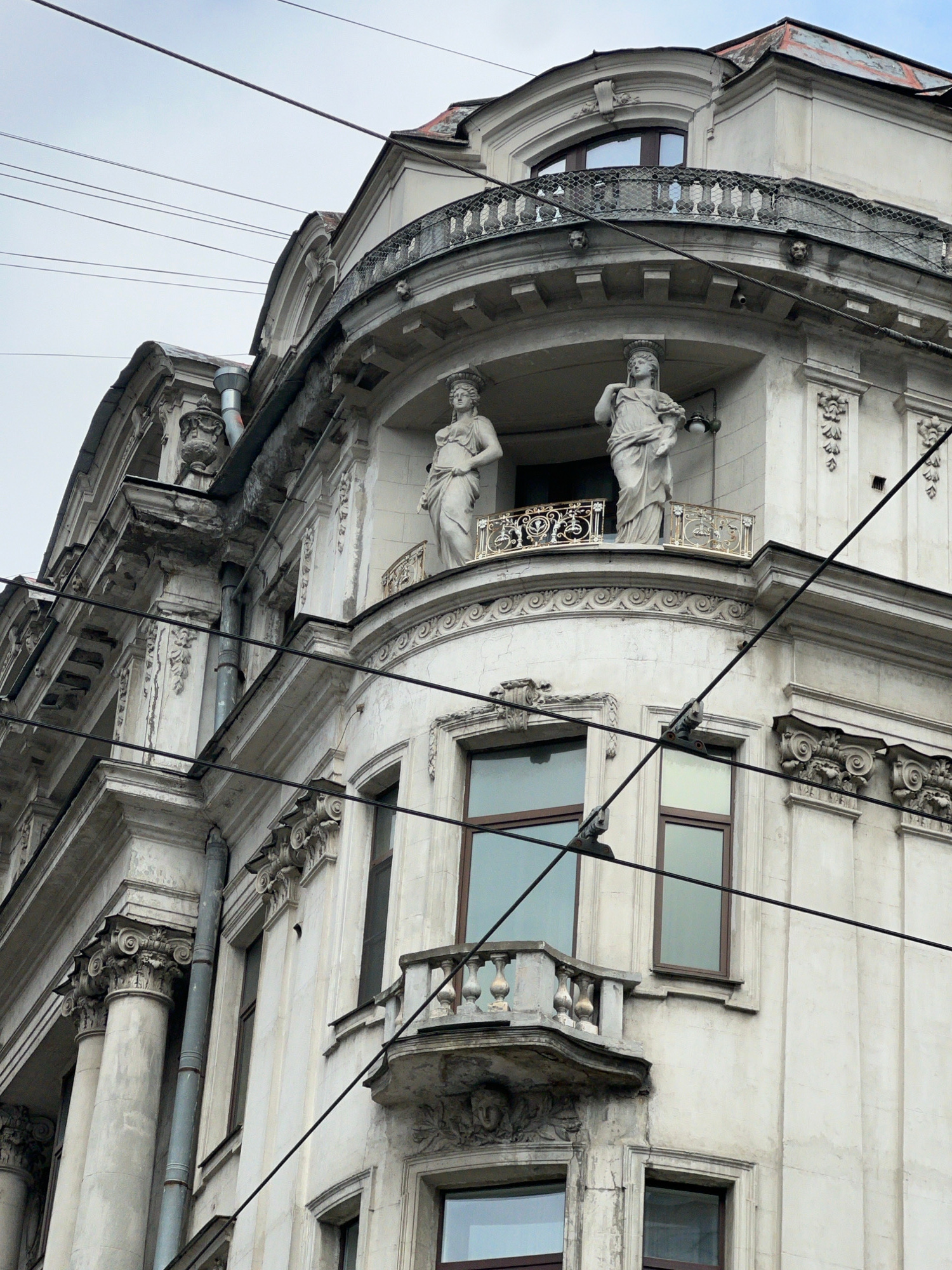 The image shows an upward view of a corner building in Saint Petersburg, Russia. The architectural style is ornate, featuring decorative molding, cornices, and details. Two classical statues stand onβ¦read more