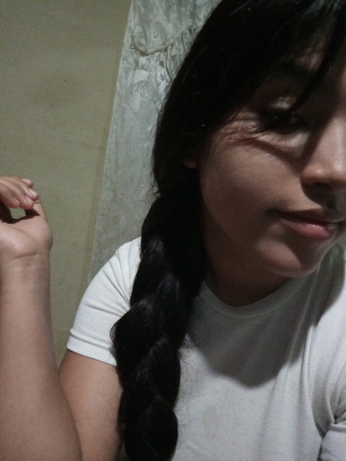 A young woman with dark hair braided down her chest wears a plain white t-shirt. Her eyes are cast down, and she has a soft smile. She holds her hand up in the air, bent at the wrist. A textured wall…read more