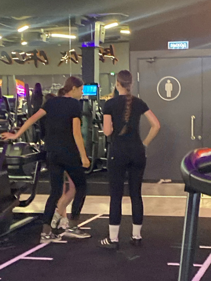 Two women in black athletic wear are at the gym. The woman in the background has a long braid and is wearing striped socks with sneakers. The other woman appears to be using gym equipment and has her…read more