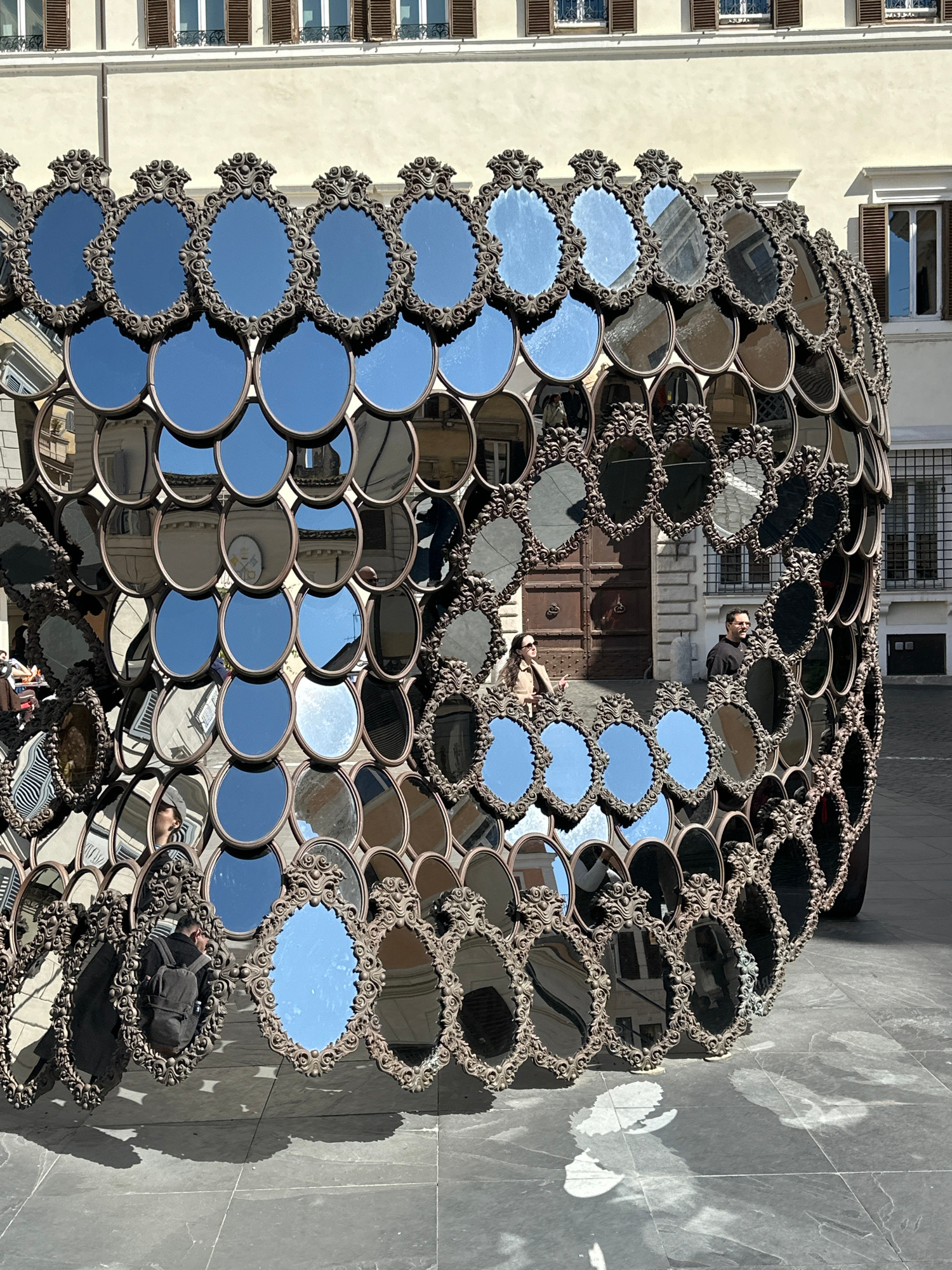 The scene depicts an outdoor art installation situated on a paved square in the city of Rome, Italy, under bright daylight. The central object is a large, curved structure composed of numerous interlo…read more
