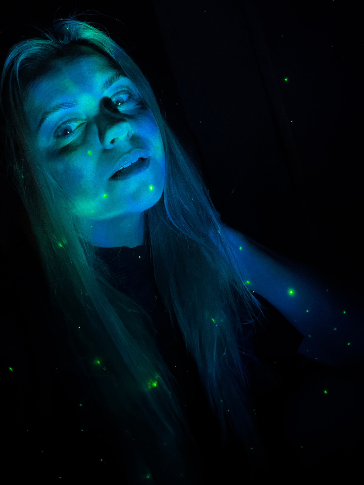The image displays a close-up, angled portrait of a woman against a completely dark, seemingly black, background. Her face and visible areas of her upper body, along with her long, light-colored hair,…read more