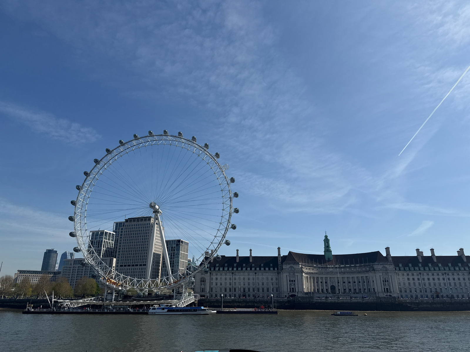 The image shows the London Eye, a large Ferris wheel on the bank of the River Thames in London, United Kingdom. The Houses of Parliament are visible on the opposite bank of the river. Several boats ar…read more