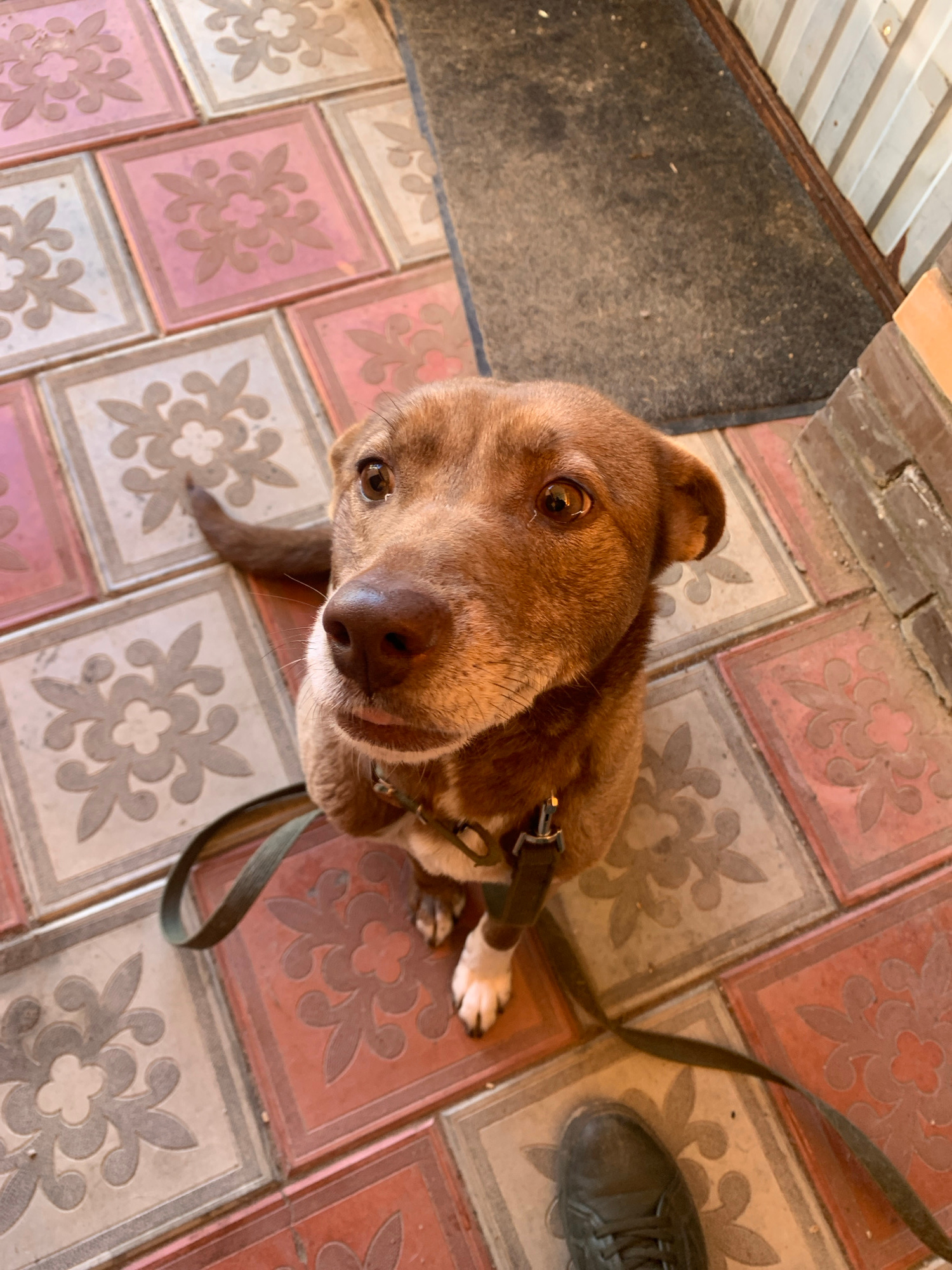 A medium-sized brown dog with a dark brown harness and green leash is the central subject of the image. The dog looks upward towards the camera with pleading brown eyes. The dog stands on a tiled surf…read more