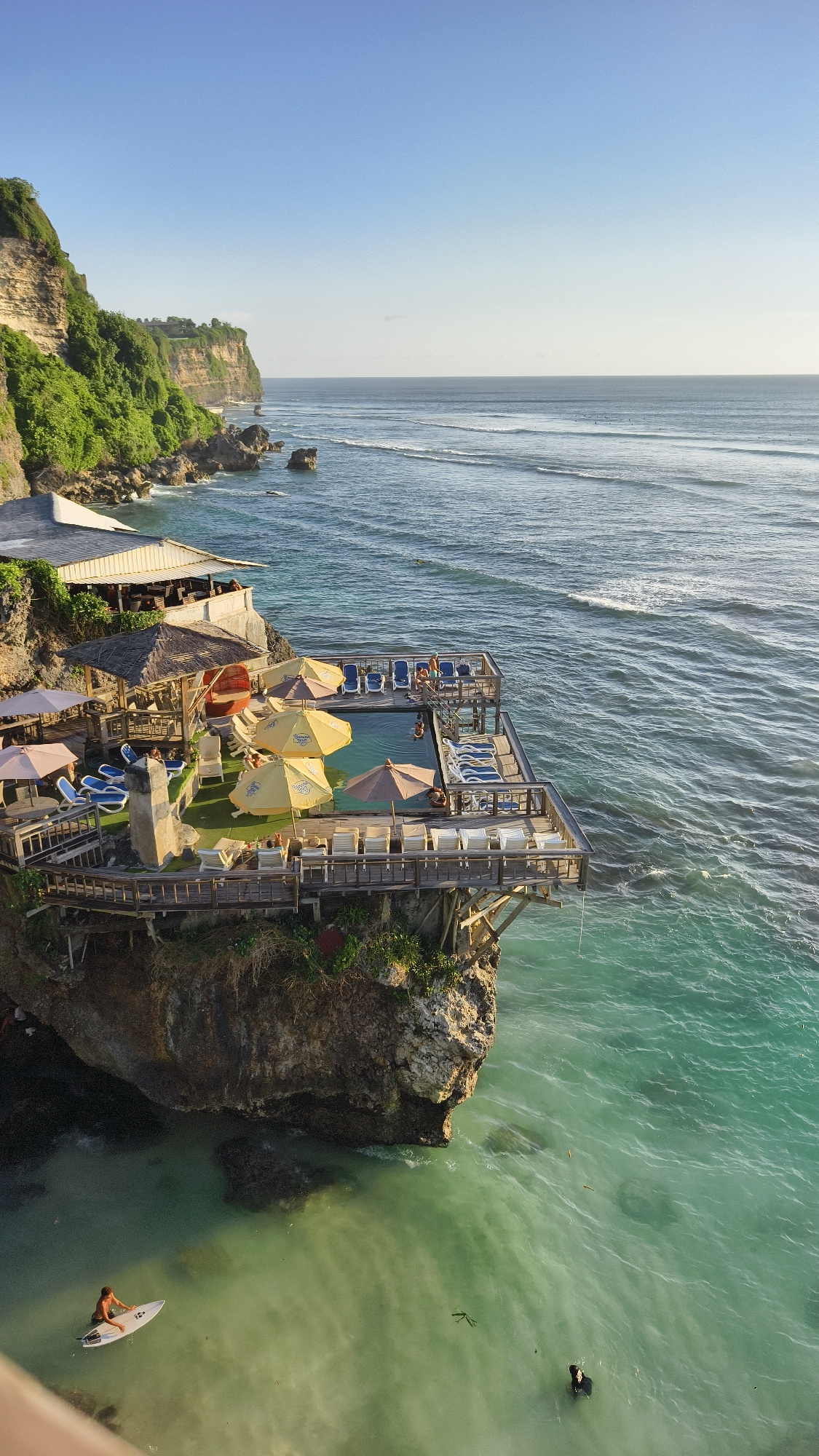 The image depicts a coastal scene in Pecatu, Indonesia, featuring a wooden structure built atop a rocky cliff. This structure houses a restaurant and a swimming pool area with lounge chairs and umbrel…read more