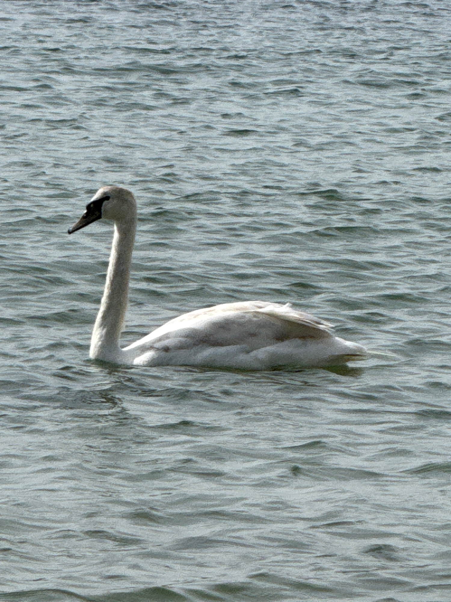 A white swan floats on water with prominent waves, its head and neck extending leftward. The setting is Varna, Bulgaria.