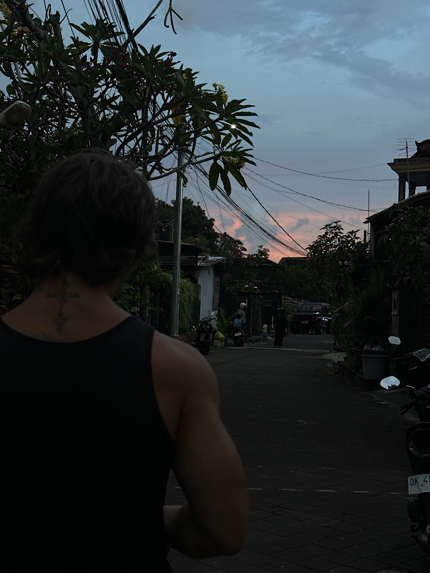 The image, taken in Dalung, Indonesia, shows a person wearing a black tank top from the back, with a tattoo visible on the neck. The scene is an urban street with a narrow paved road and buildings obs…read more