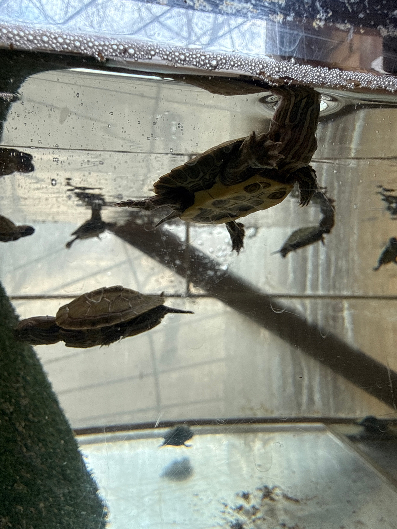 The image depicts several turtles in a glass enclosure filled with water. One turtle is clinging to the side of the glass, while another appears to be resting on a bed of green material at the bottom.…read more