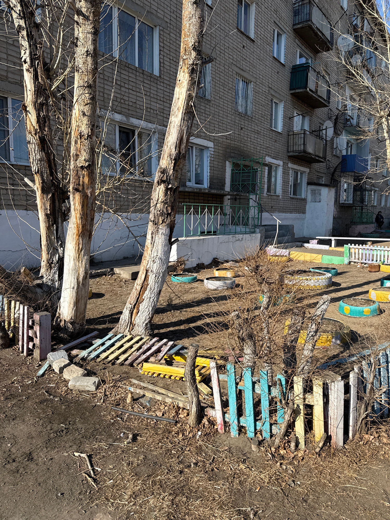 The image shows a view from above, likely a high vantage point, of a courtyard area adjacent to an apartment building in Borzya, Russia. The apartment building is constructed of gray brick and has mu…read more