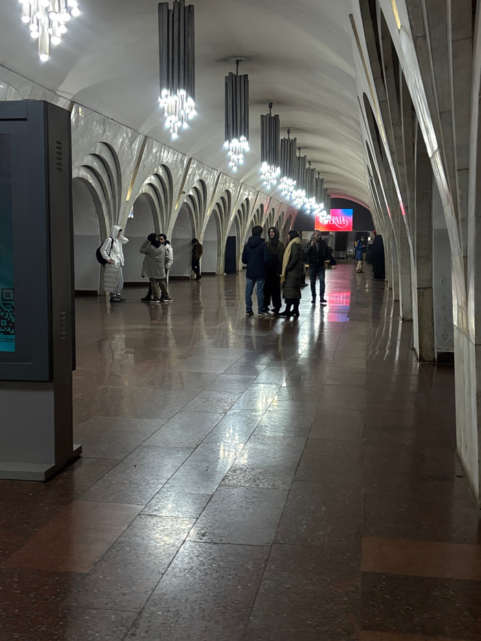 This image depicts the interior of the Yeritasardakan Metro Station platform in Yerevan, Armenia. The scene features a long, vaulted passage with a high ceiling and repeating series of decorative, lig…read more