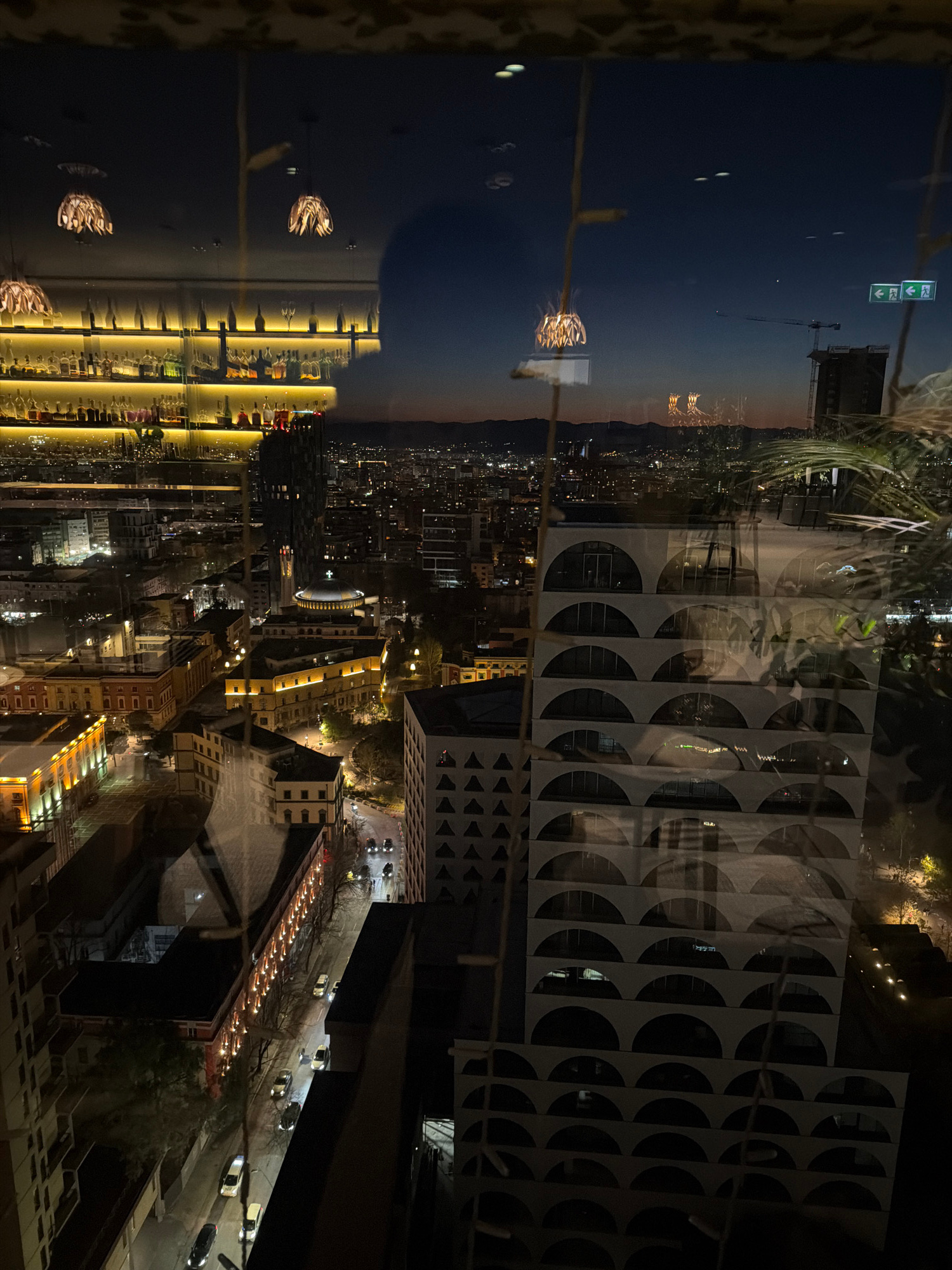 The image depicts a nighttime cityscape, likely taken from a high vantage point, possibly within a building in Tirana, Albania. The view encompasses a mix of modern and older architectural styles, wit…read more