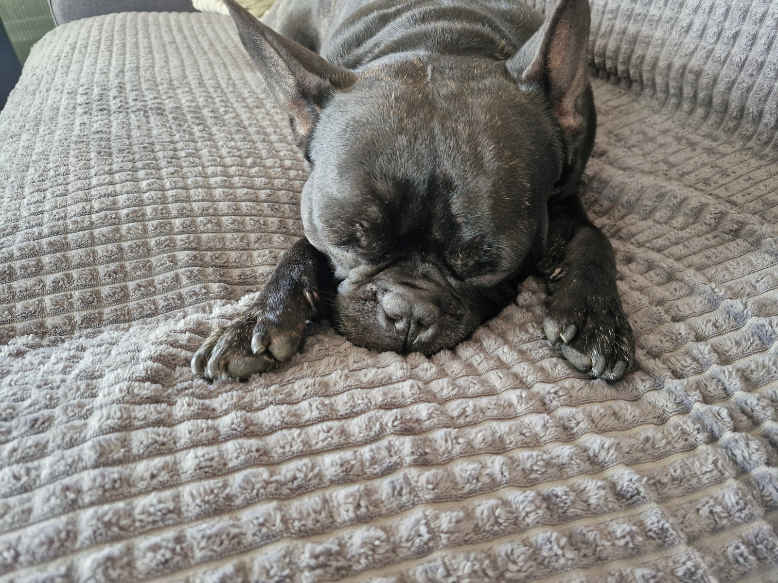 A black French Bulldog is depicted lying down, seemingly asleep, on a textured grey blanket or cushion. The dog is positioned centrally in the frame, with its head resting on its front paws and its ey…read more
