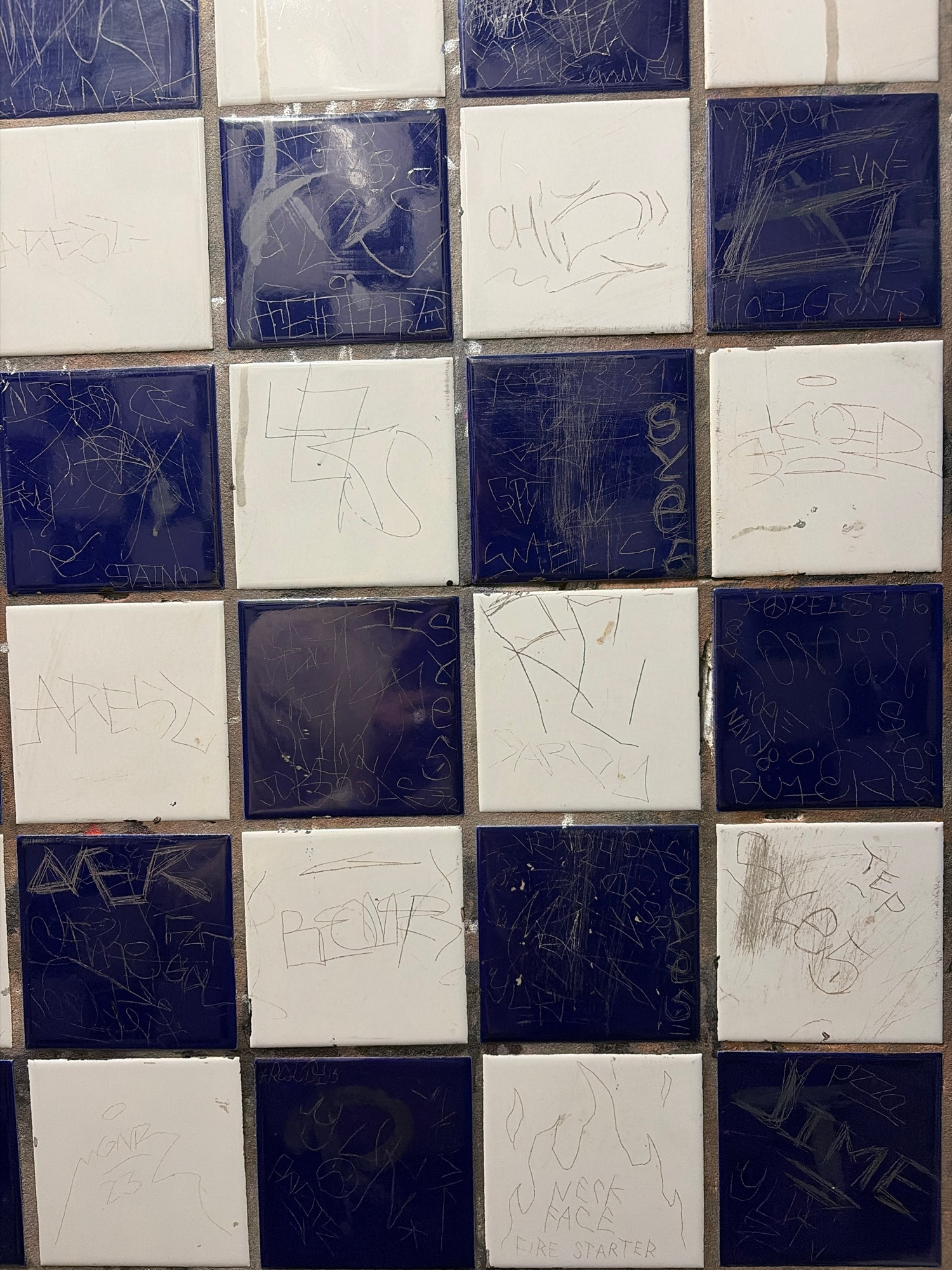 The image shows a section of a tiled surface, likely a countertop or wall, made up of square tiles in a checkerboard pattern of alternating dark blue and white. The tiles are defaced with graffiti. Th…read more