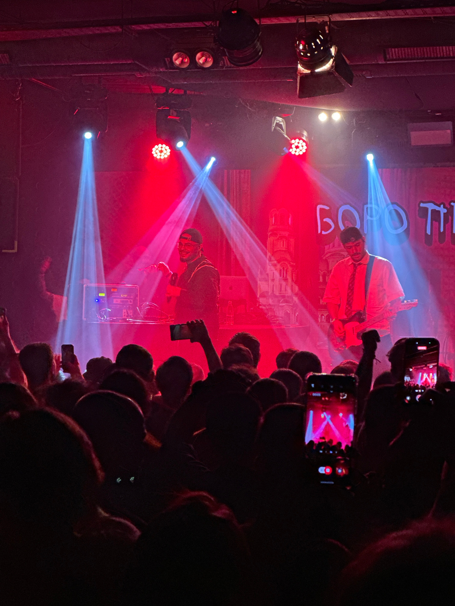 The image depicts a live musical performance, likely a concert. Two individuals are visible on stage, illuminated by a combination of red and blue stage lights. One person is dressed in a white shirt…read more