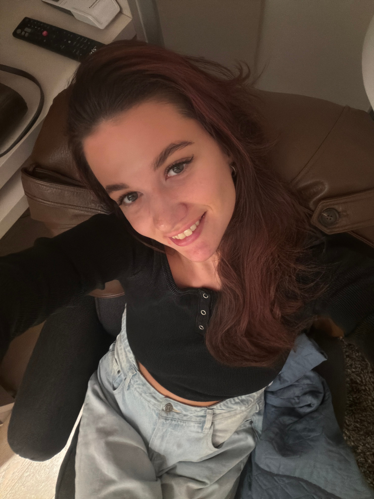 An indoor, high-angle photograph depicts a young adult female seated in a brown leather-like armchair, smiling directly at the camera. She has long, wavy brown hair with reddish highlights and is wearβ¦read more