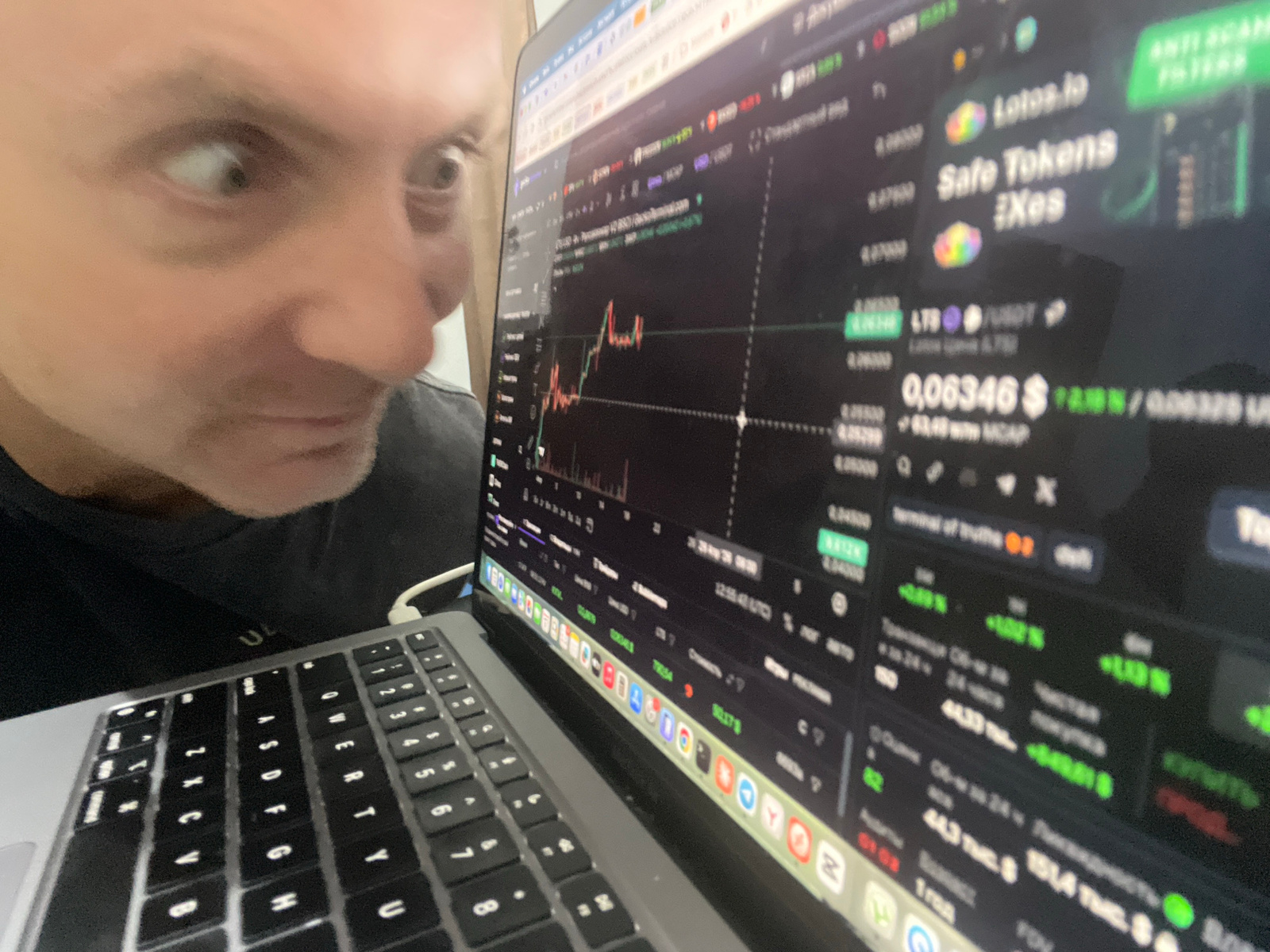The image captures a close-up, rotated view of a person intently looking at a laptop screen, likely indoors in Sukawati, Indonesia. The perspective is tilted 90 degrees clockwise, placing the person's…read more