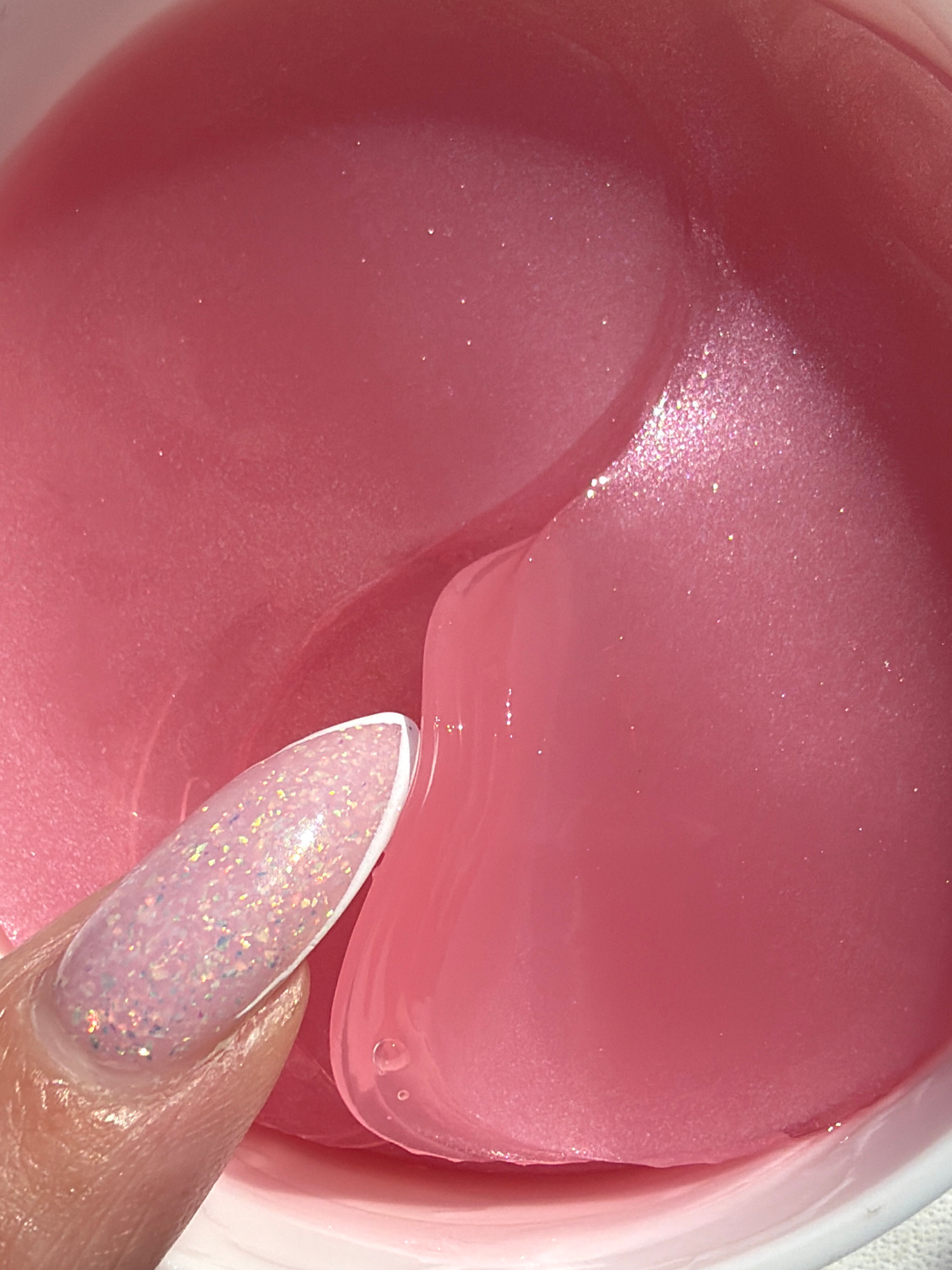 A close-up shot shows a finger with a glittery nail dipping into a container of pink, gel-like substance, most likely cosmetic eye patches. The scene lacks any indication of location or specific detai…read more