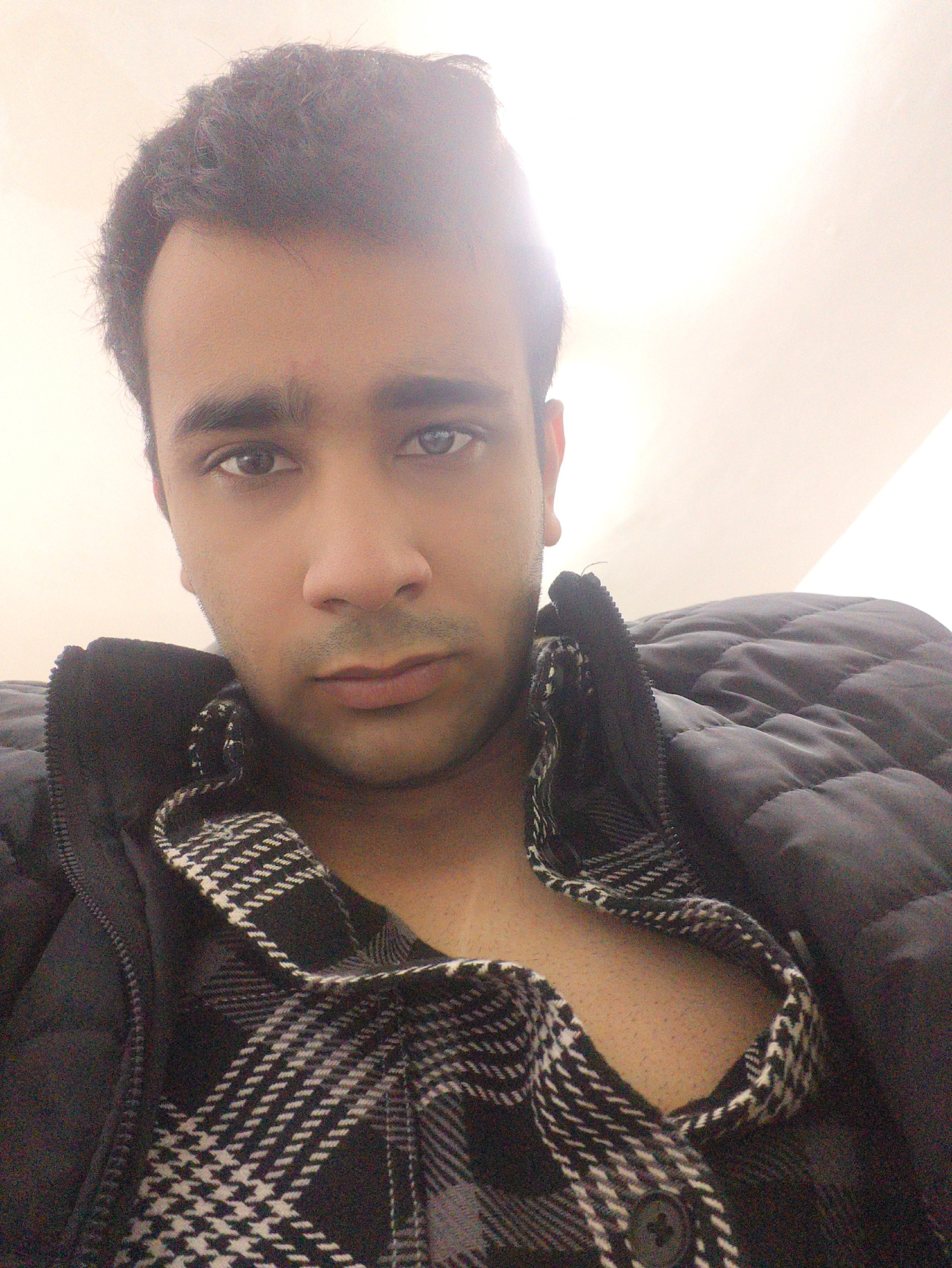 A close-up selfie depicts a young man with dark hair, eyes, and complexion. He's wearing an open black and white patterned shirt beneath a black quilted jacket. The background is a plain, bright, inde…read more