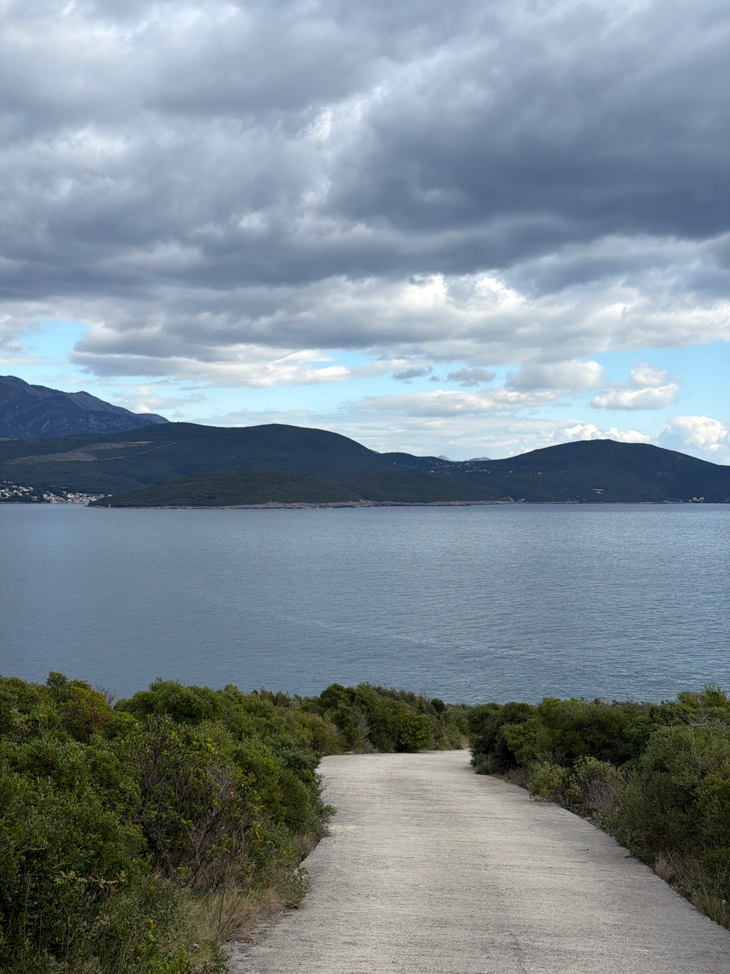 The image depicts a coastal scene, potentially along the Adriatic Sea. A paved road is seen on the right side of the image, bordered by lush green vegetation. To the left of the vegetation, the image shows the sea with mountainous land visible across the water. The sky is filled with clouds, some dark and ominous, while others are lighter with patches of blue sky showing through. The image is in Radovići, Montenegro. | Open Wire