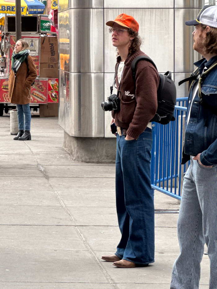 Three people stand outdoors. A person with a camera and backpack wears a brown sweater, orange hat, and blue jeans with brown boots. Behind them, another person wears a denim jacket, striped pants, an…read more