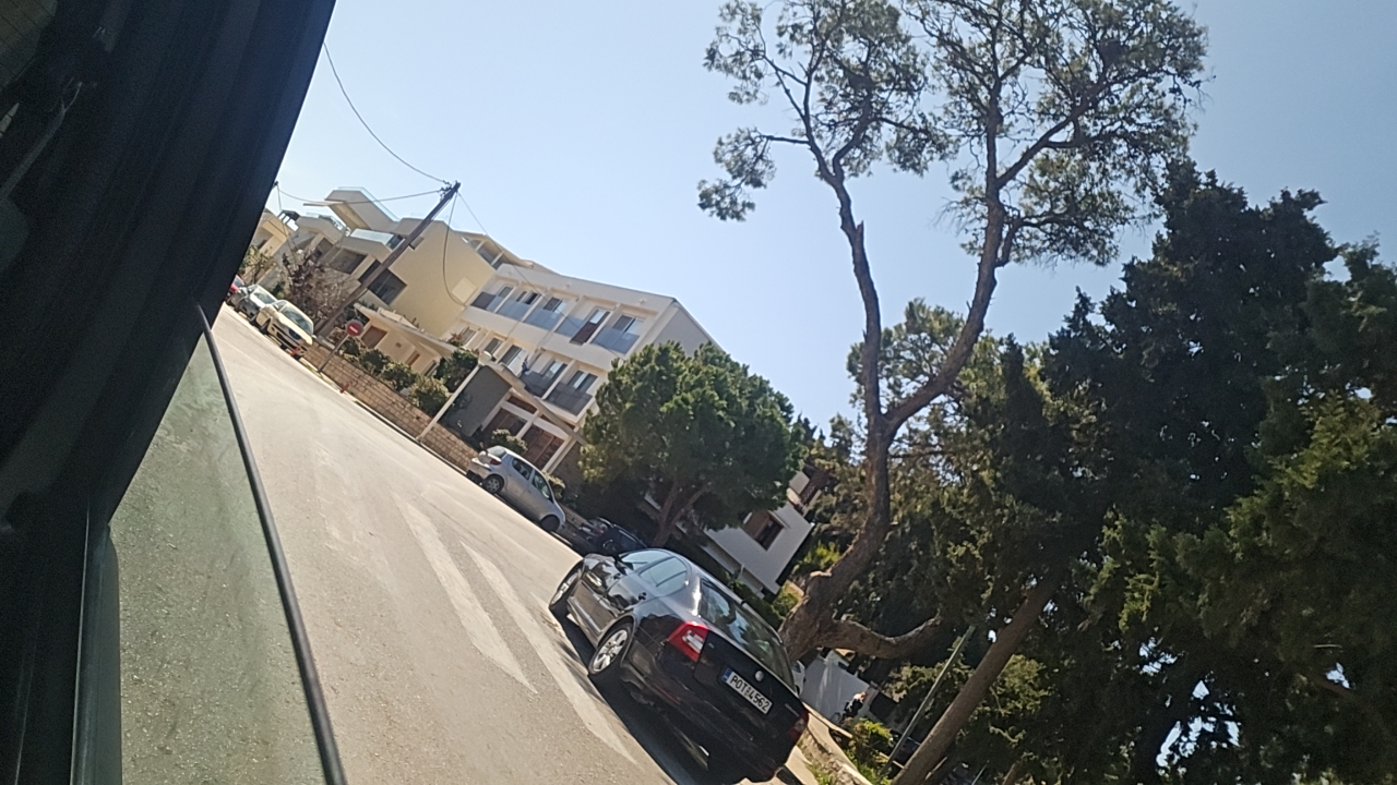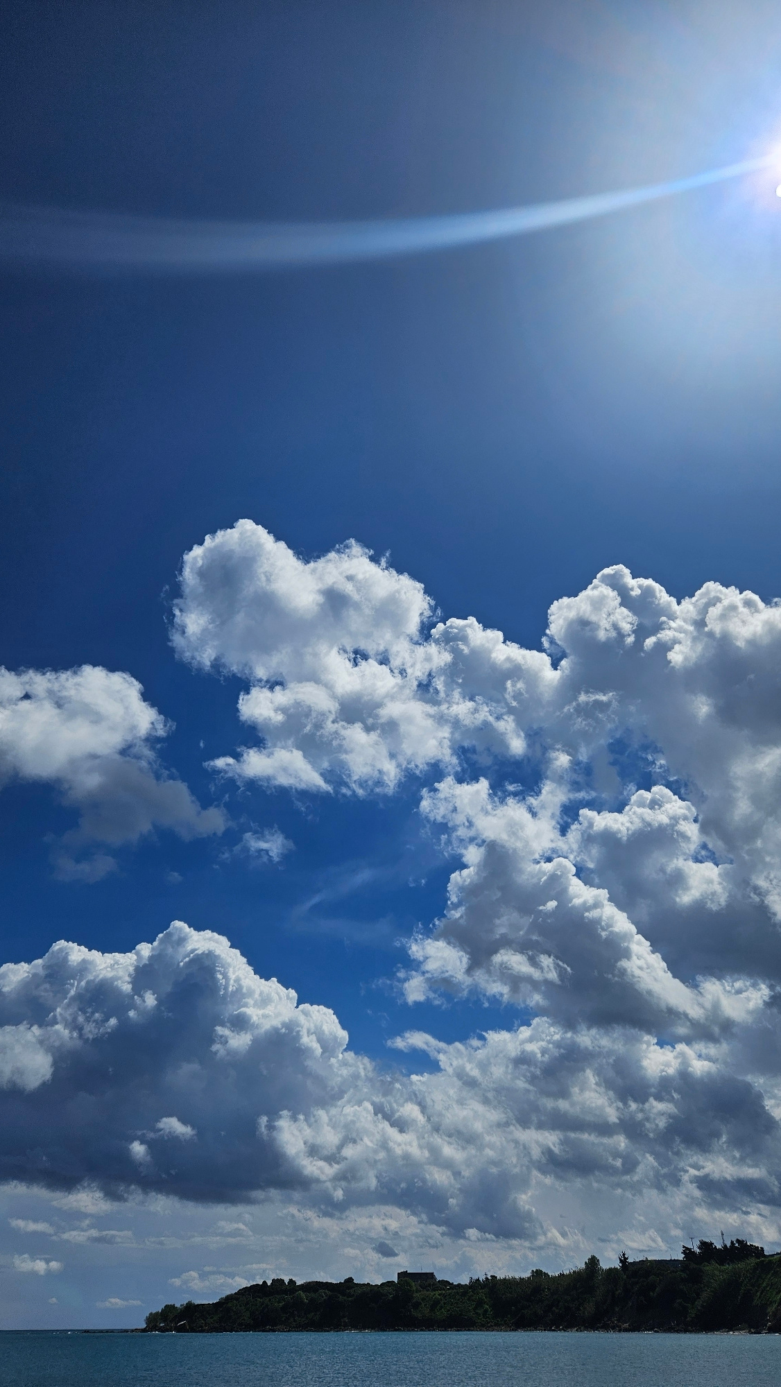 A low-angle, wide, outdoor shot captures a sunny day with predominantly blue skies, large white cumulus clouds, and a glimpse of a coastline. A bright sun is present in the upper left corner of the fr…read more