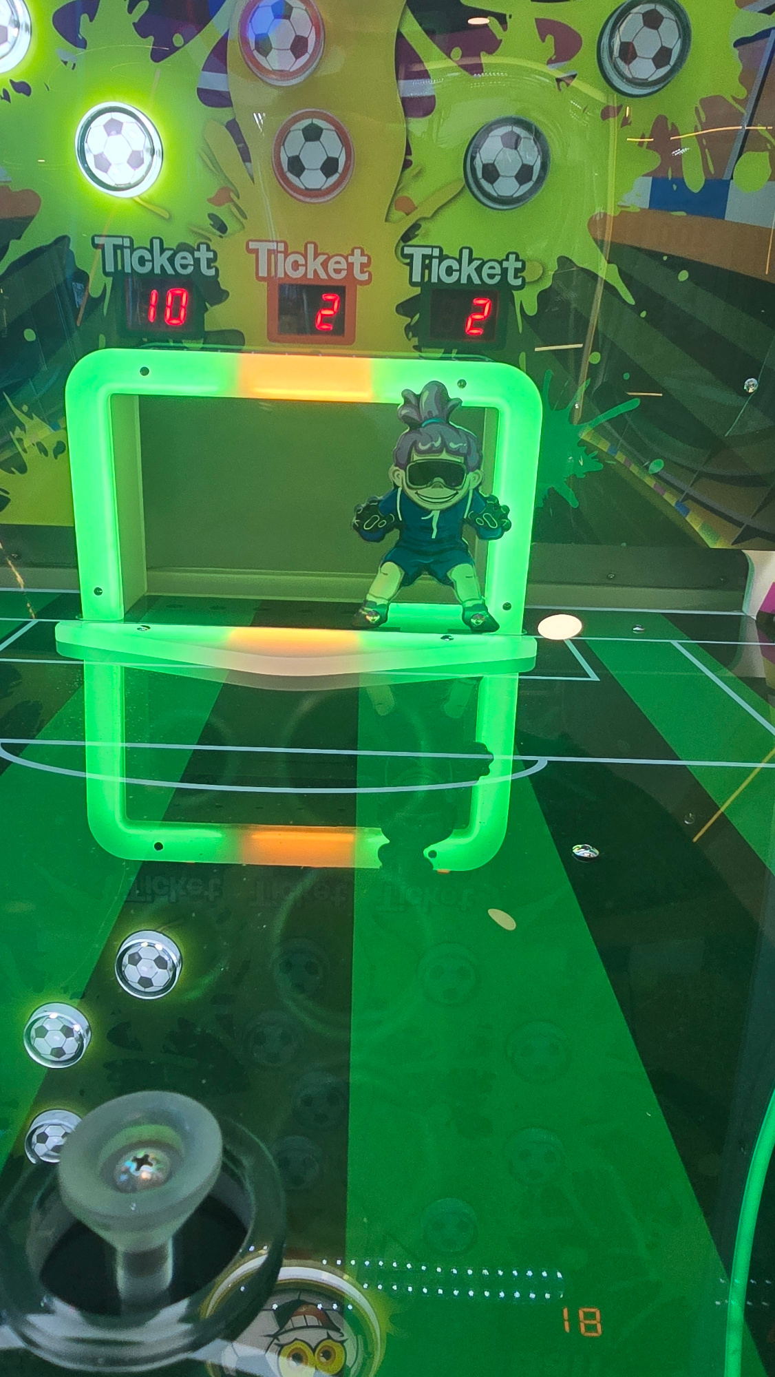 The image shows a tilted overhead view of a soccer-themed arcade game. The game features green neon tubing forming a gate-like structure through which a ball is likely intended to pass. There is a car…read more