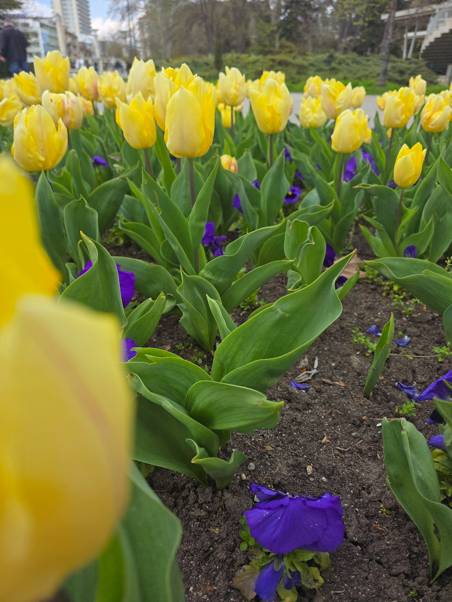 The image captures a flowerbed in what appears to be a park or public garden. Predominantly, there's a line of bright yellow tulip flowers, with some blooming open and others still partially closed. I…read more