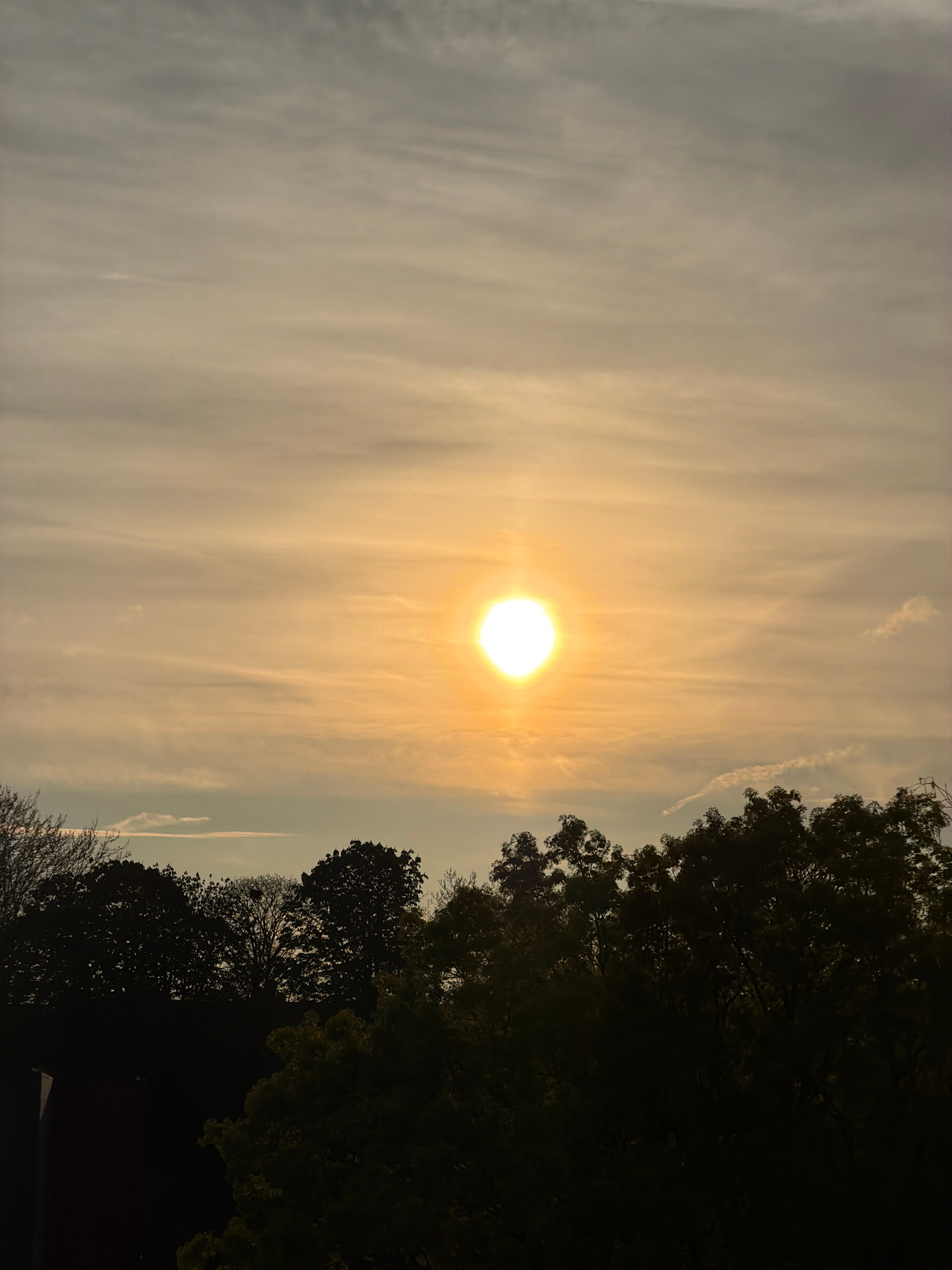The image shows a bright sun in the sky, partially obscured by thin clouds. To the right of the sun, there are silhouetted tree branches and leaves. The sky is a pale yellow color with wispy clouds th…read more