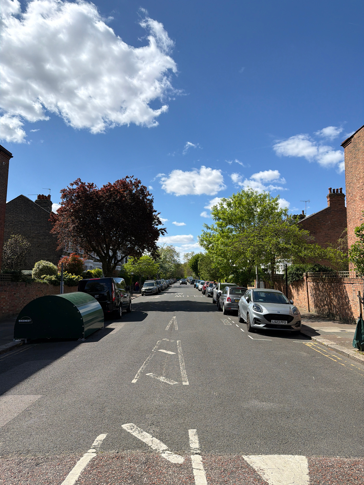 The image depicts a residential street in London, United Kingdom, on a sunny day with scattered clouds in a bright blue sky. The road is lined with parked cars on both sides. A silver Ford Fiesta with…read more
