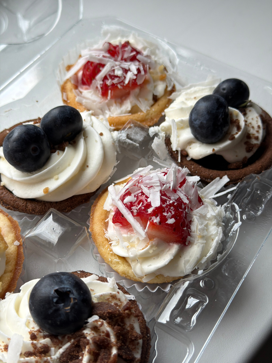 A high-angle, close-up shot captures a selection of miniature tarts or pastries nestled within a clear plastic container. The scene is static, focusing entirely on the confectionery. The container ho…read more