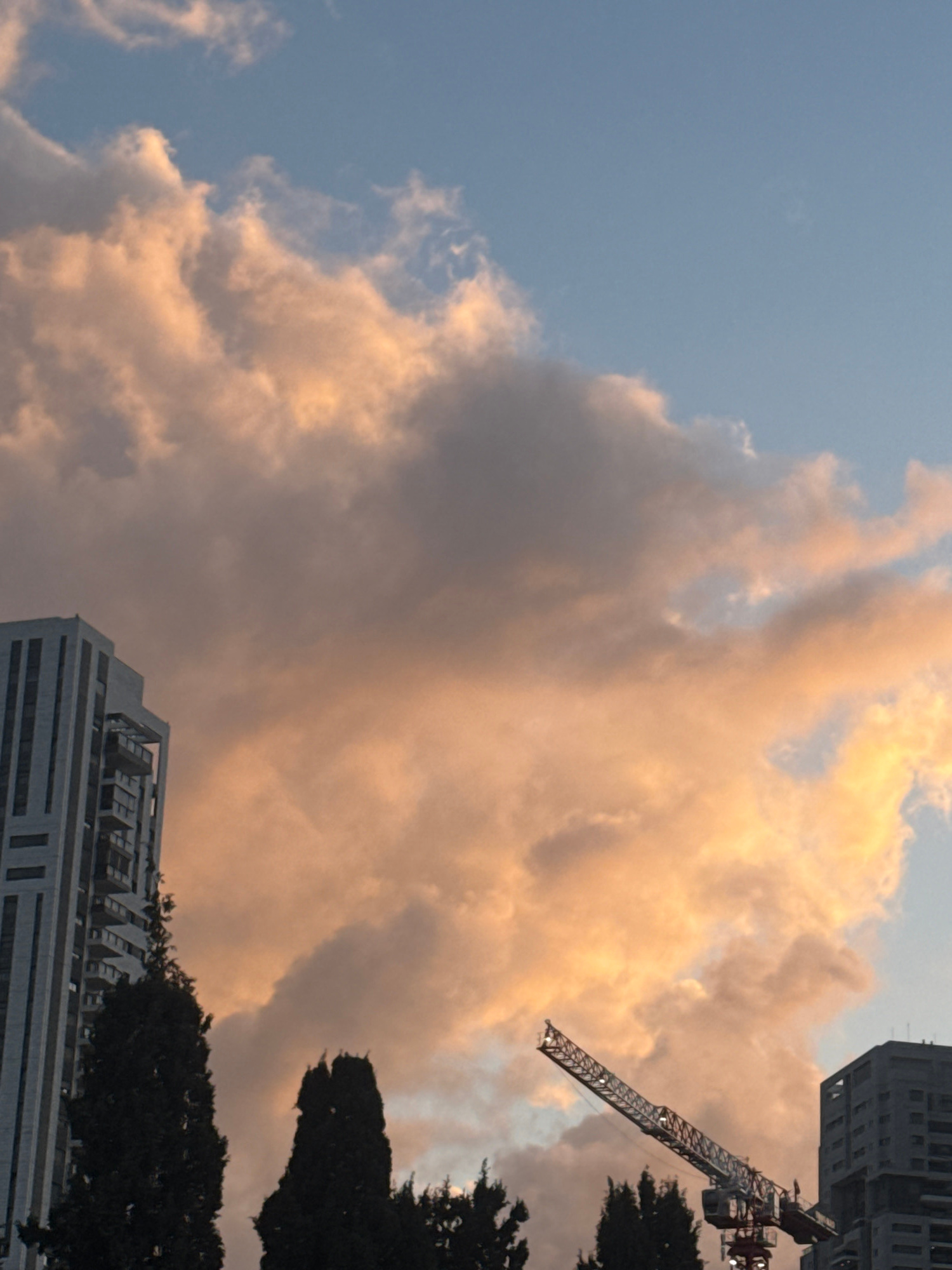 The image is an upward-angled view featuring a cityscape in Bat Yam, Israel, at dusk or dawn. Dominating the scene are large, golden-hued clouds occupying the central area. Buildings are situated at t…read more