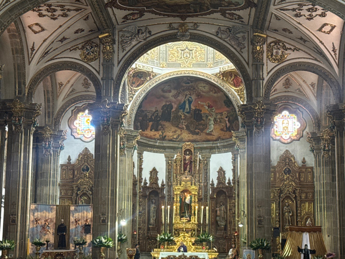 The image depicts the interior of the Metropolitan Cathedral of Mexico City, Mexico, specifically focusing on the main altar area, known as the Altar of Forgiveness. The scene presents a grand, highl…read more