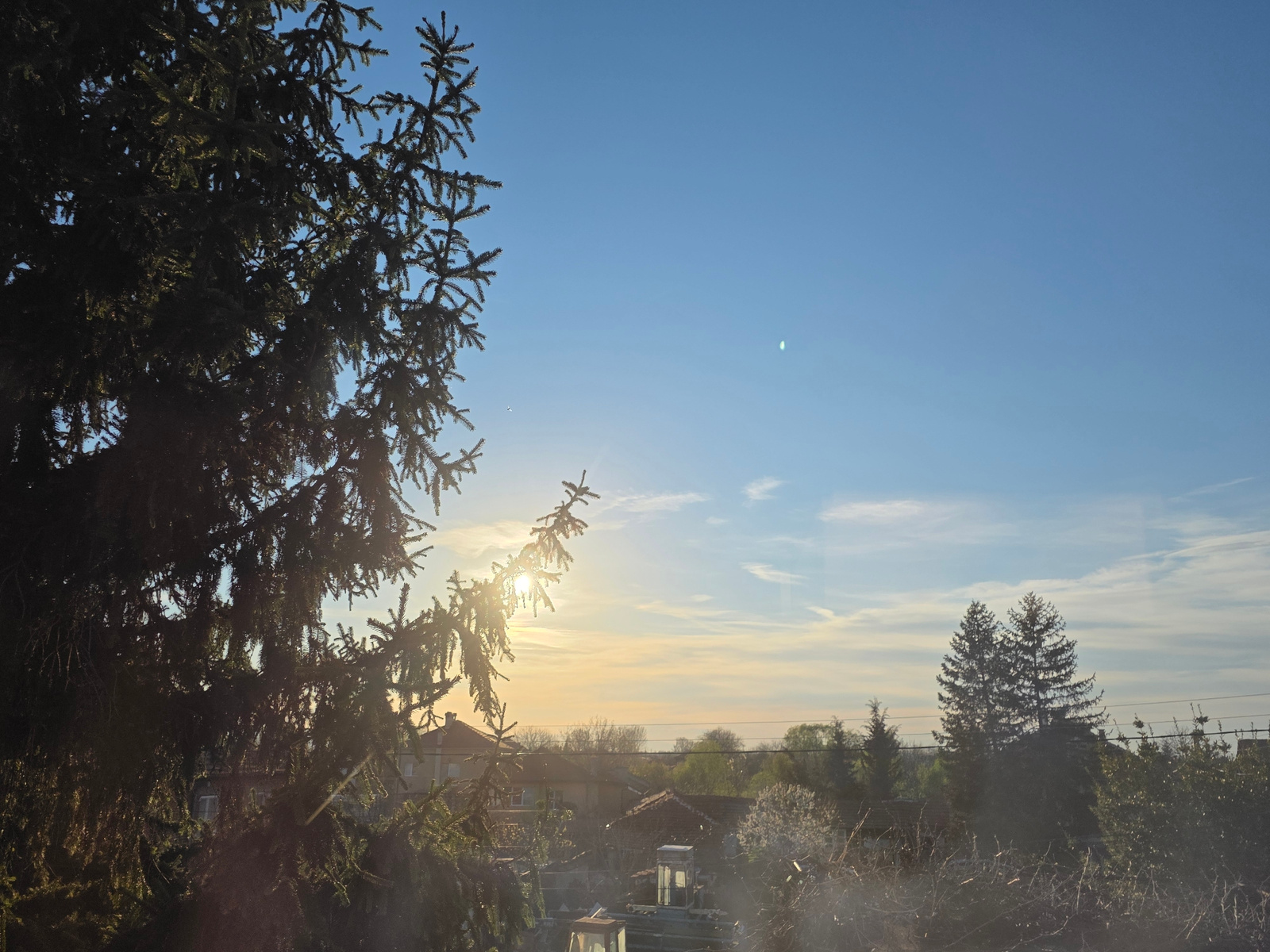 The image shows a view from a window in Yagodovo, Bulgaria. A large evergreen tree is in the left foreground, obscuring some of the view. The sun is visible through the branches, positioned just above…read more