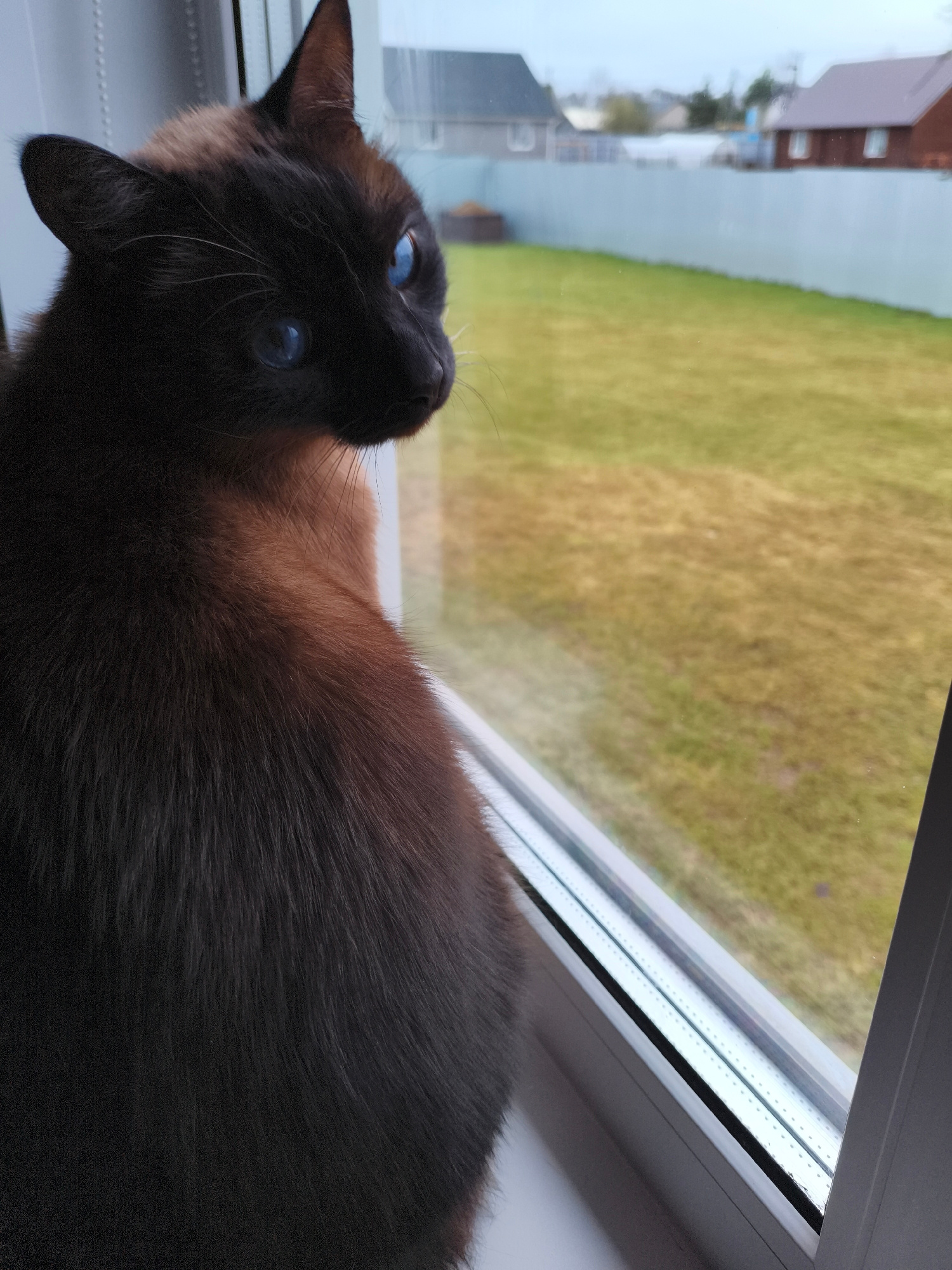 A Siamese cat with deep blue eyes sits on a white windowsill, looking out of a window at a green lawn. In the background, houses are visible behind a light gray fence. The location is Русский Вожой, R…read more
