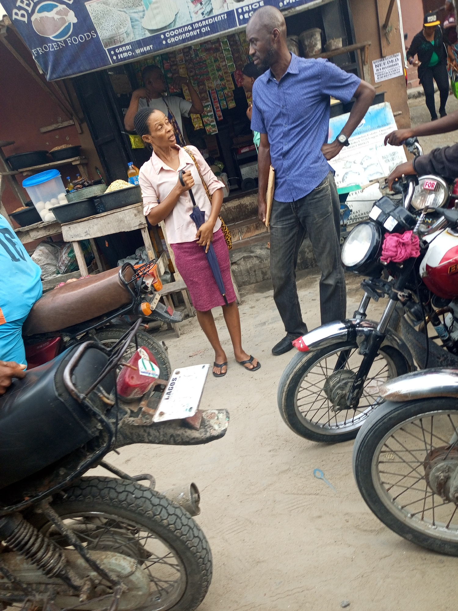 This media file captures a vibrant street scene at a market stall in Satellite Town, Nigeria, during daytime. In the foreground, two motorcycles are parked, with the one on the left showing a brown se…read more