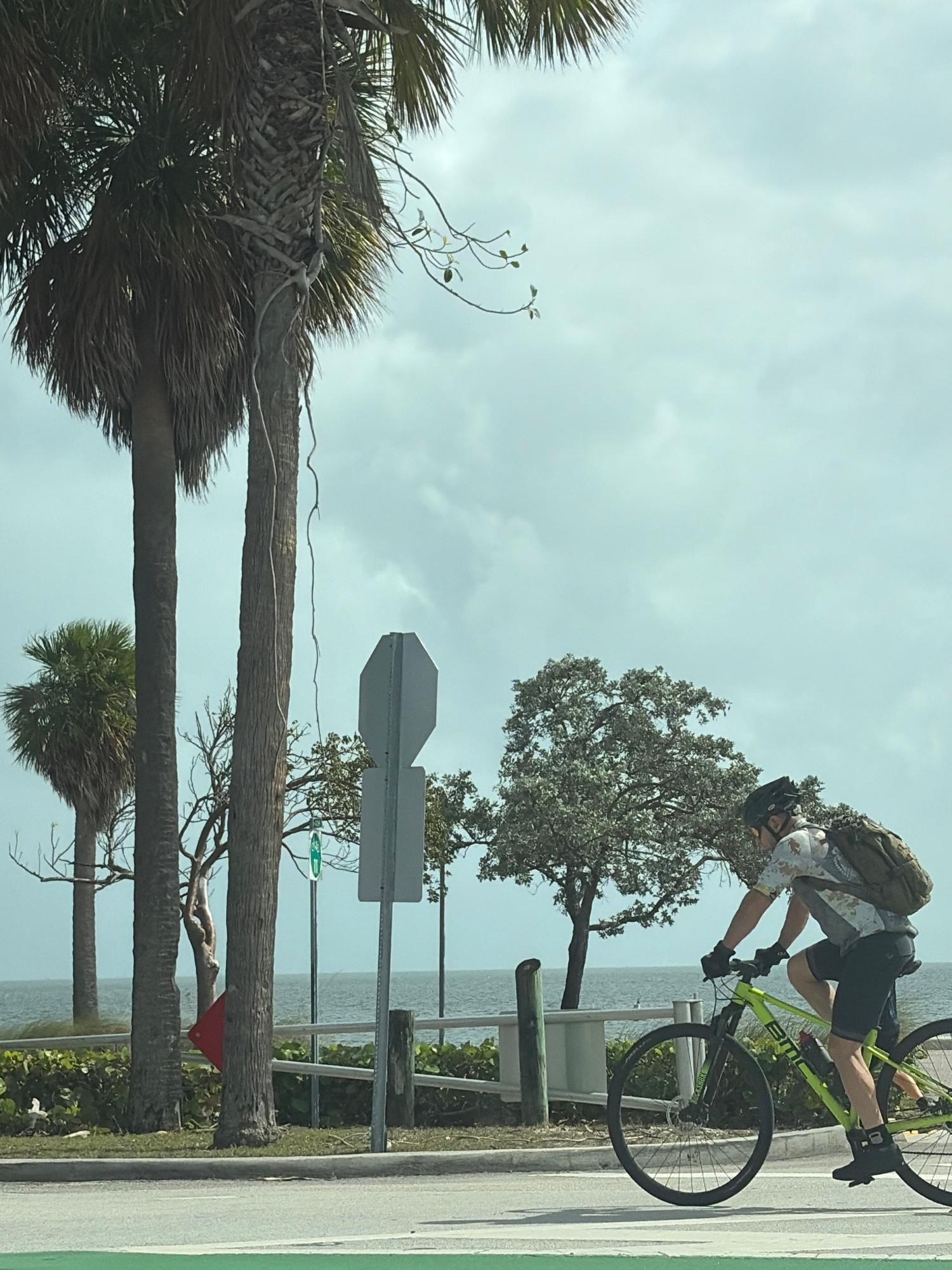 The image depicts a cyclist riding on a paved path alongside a body of water, likely the bay in Miami, Florida, United States. The cyclist is wearing a helmet, backpack, and gloves, and is riding a li…read more
