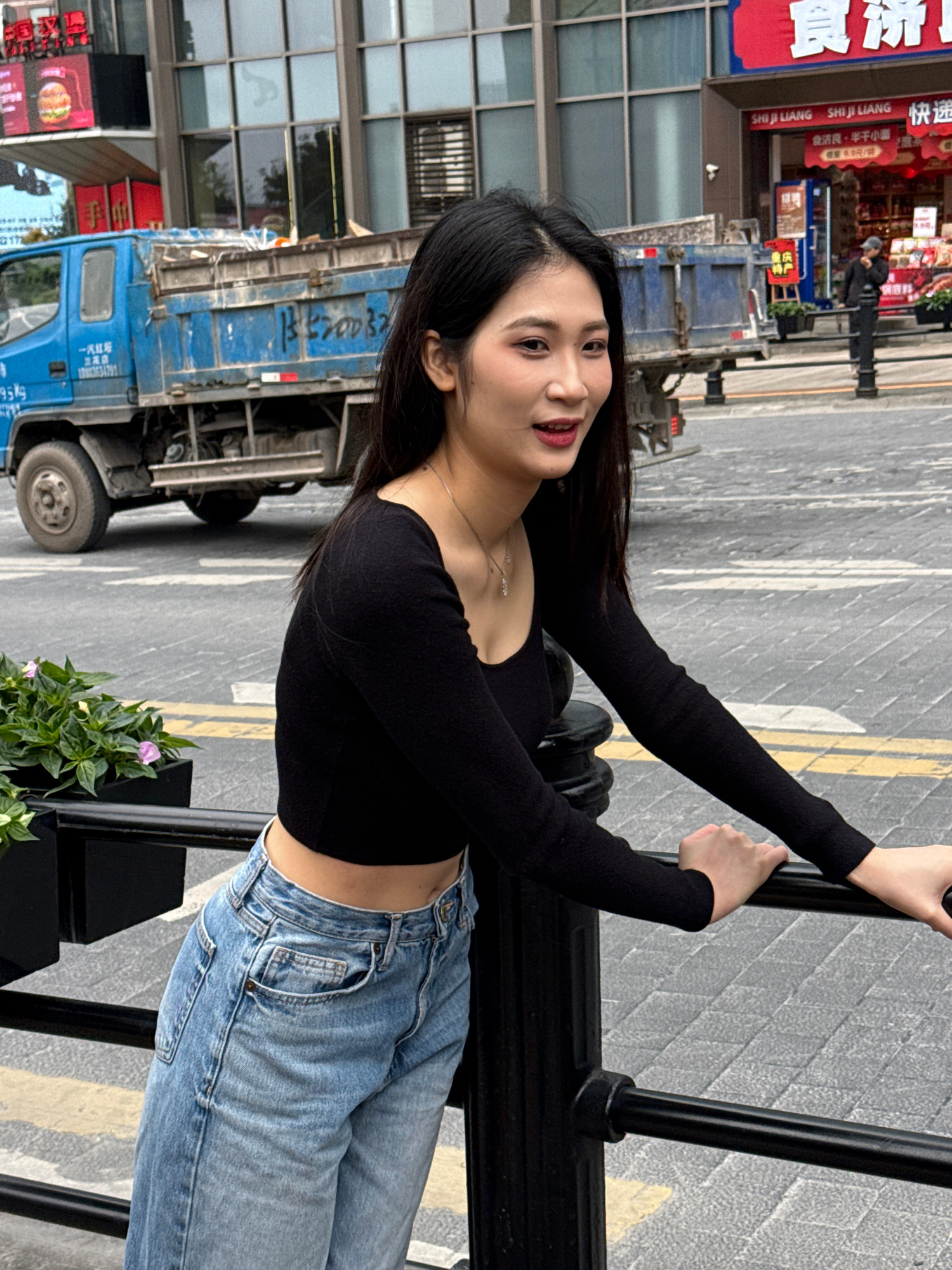 Here is a description of the image: A woman is posing for a photograph in the Yuzhong District of China. She has long, dark hair and is wearing a long-sleeved black top and jeans. She is holding onto…read more