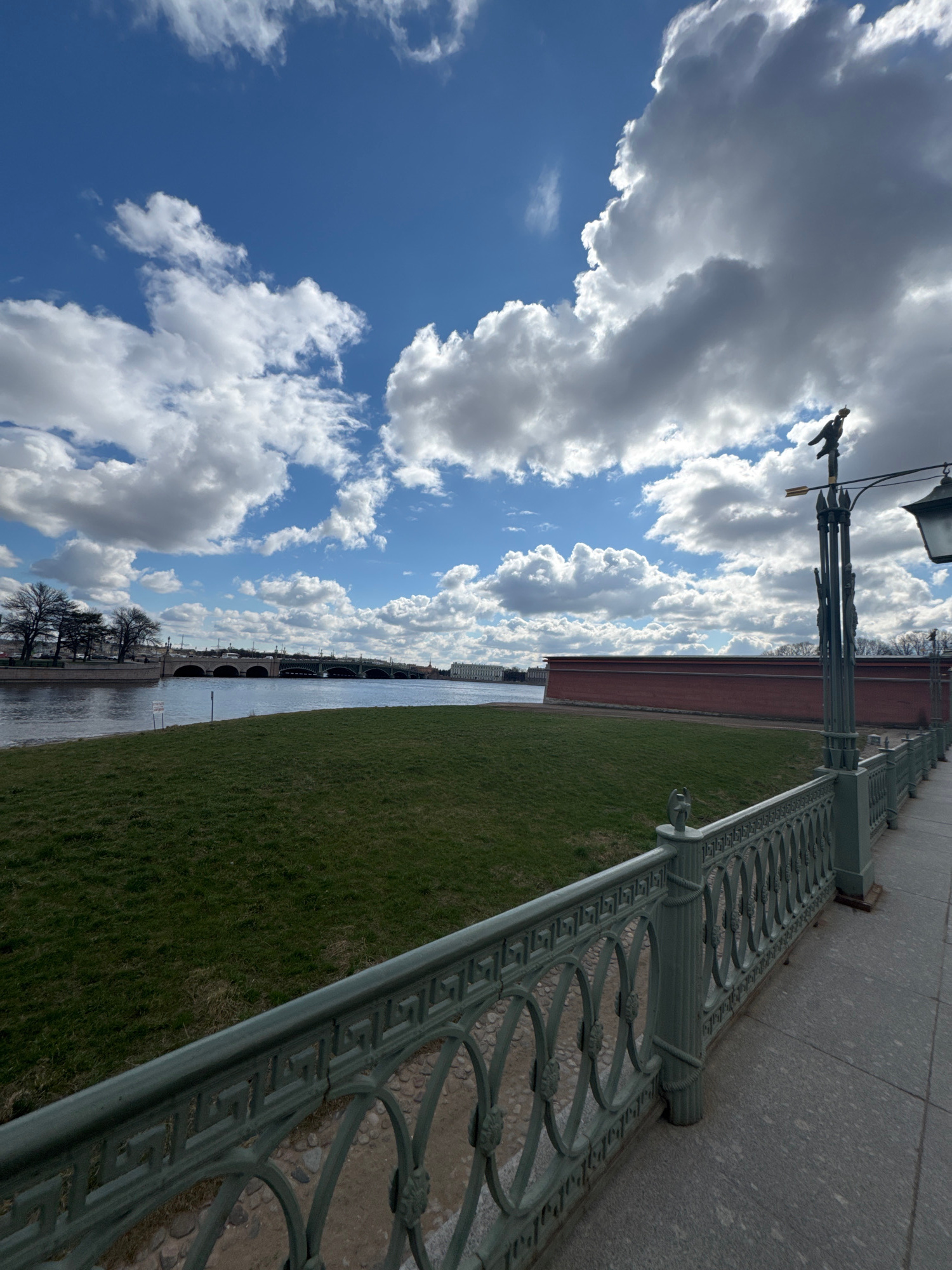The image depicts a scene in Saint Petersburg, Russia. The perspective is a ground-level view, looking up at a sky filled with white clouds against a blue sky. A decorative, green-painted metal railinβ¦read more