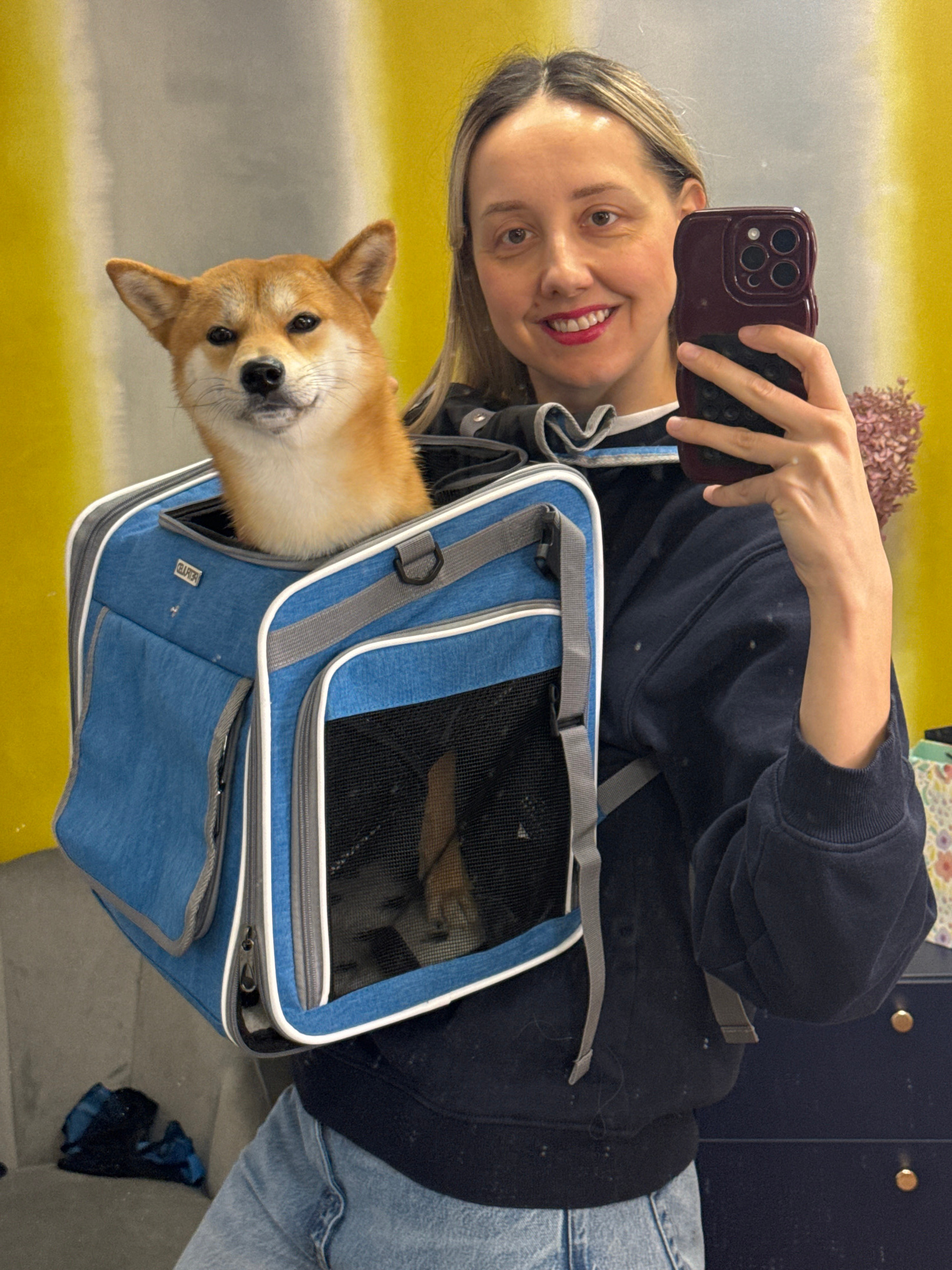 An indoor selfie captures a smiling woman and her Shiba Inu dog. The woman, with light brown hair and wearing a dark blue hooded sweatshirt and light blue jeans, holds a dark-cased smartphone in her r…read more