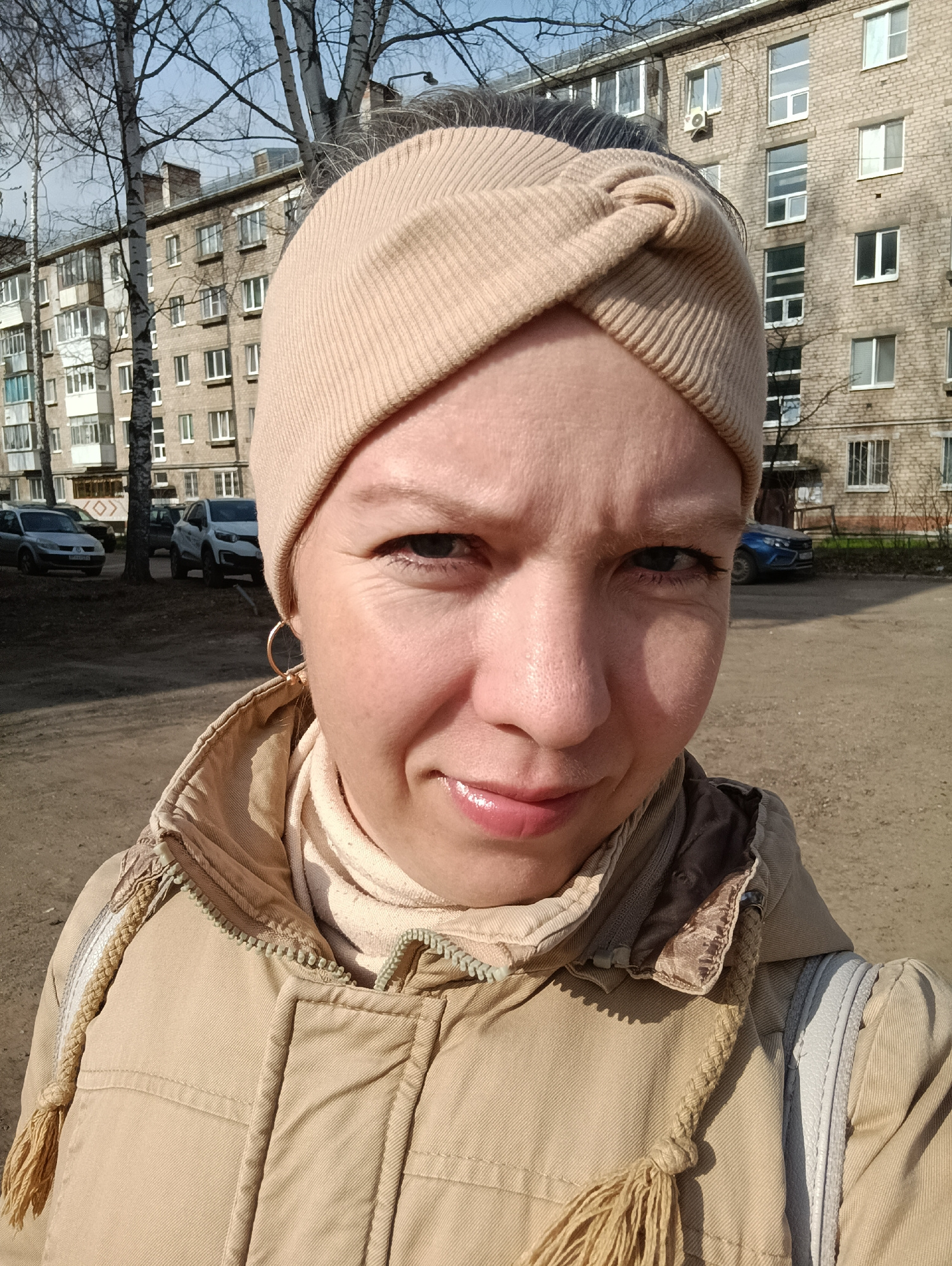A Caucasian woman is the primary subject of the photograph. She is wearing a light brown headband and a beige-colored jacket with a tassel detail. She has fair skin, grey eyes, and a slight smile. She…read more
