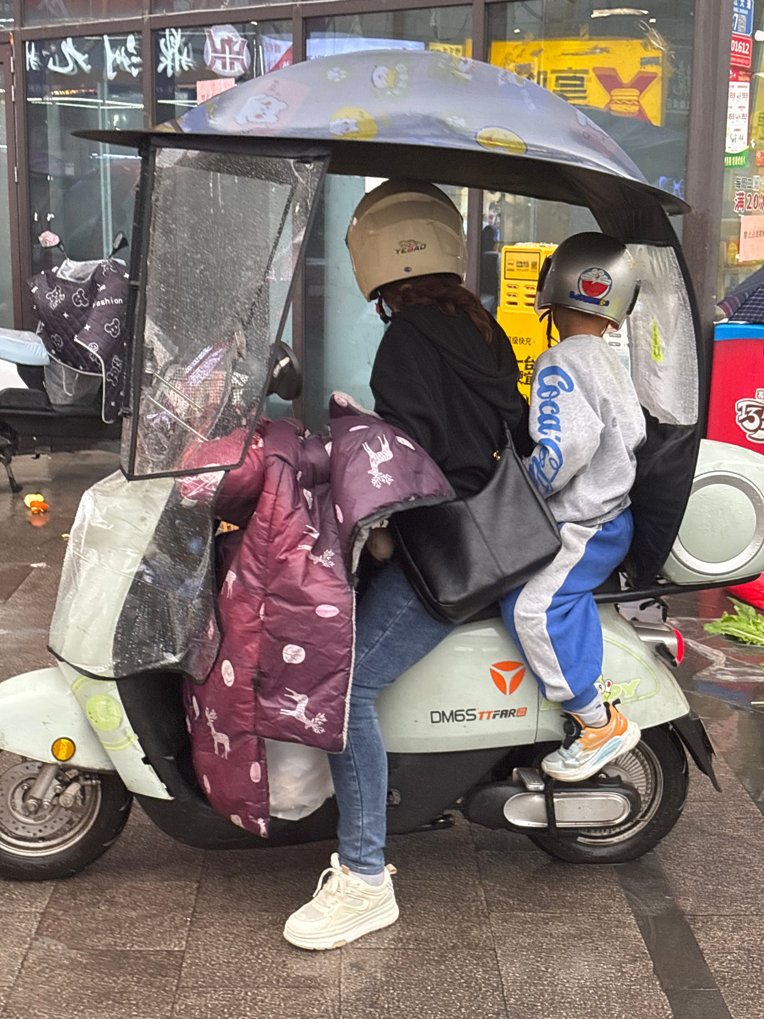 The image shows two people on an electric scooter in Jiangjin, China. The rider, wearing a tan helmet, black jacket, blue jeans, and white sneakers, is seated on the scooter. In front of them is a chi…read more
