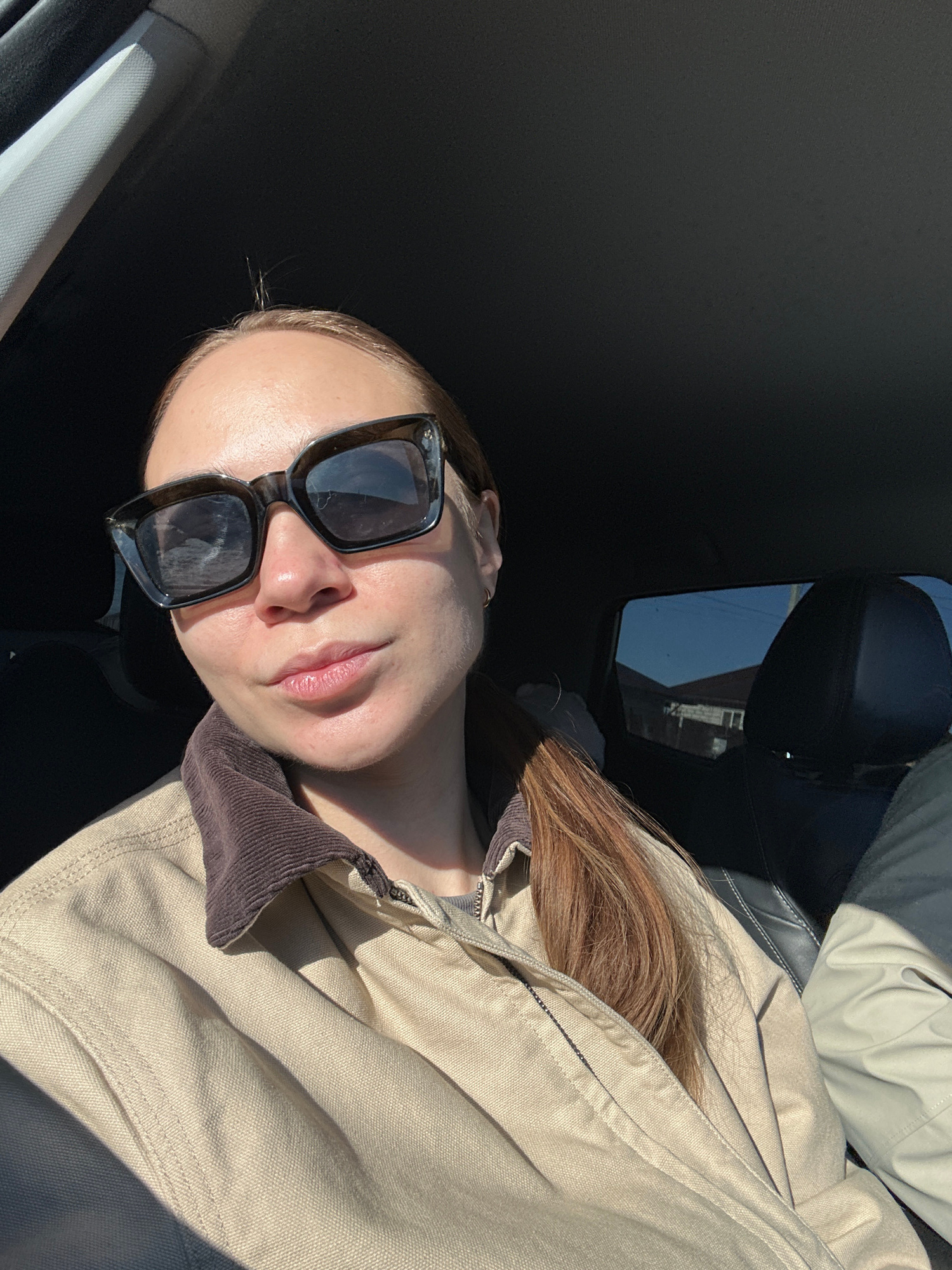 A person with light skin and reddish-brown hair, wearing sunglasses, is seated in a vehicle. The individual is facing the camera at an angle, wearing a light beige jacket over a brown garment. The veh…read more