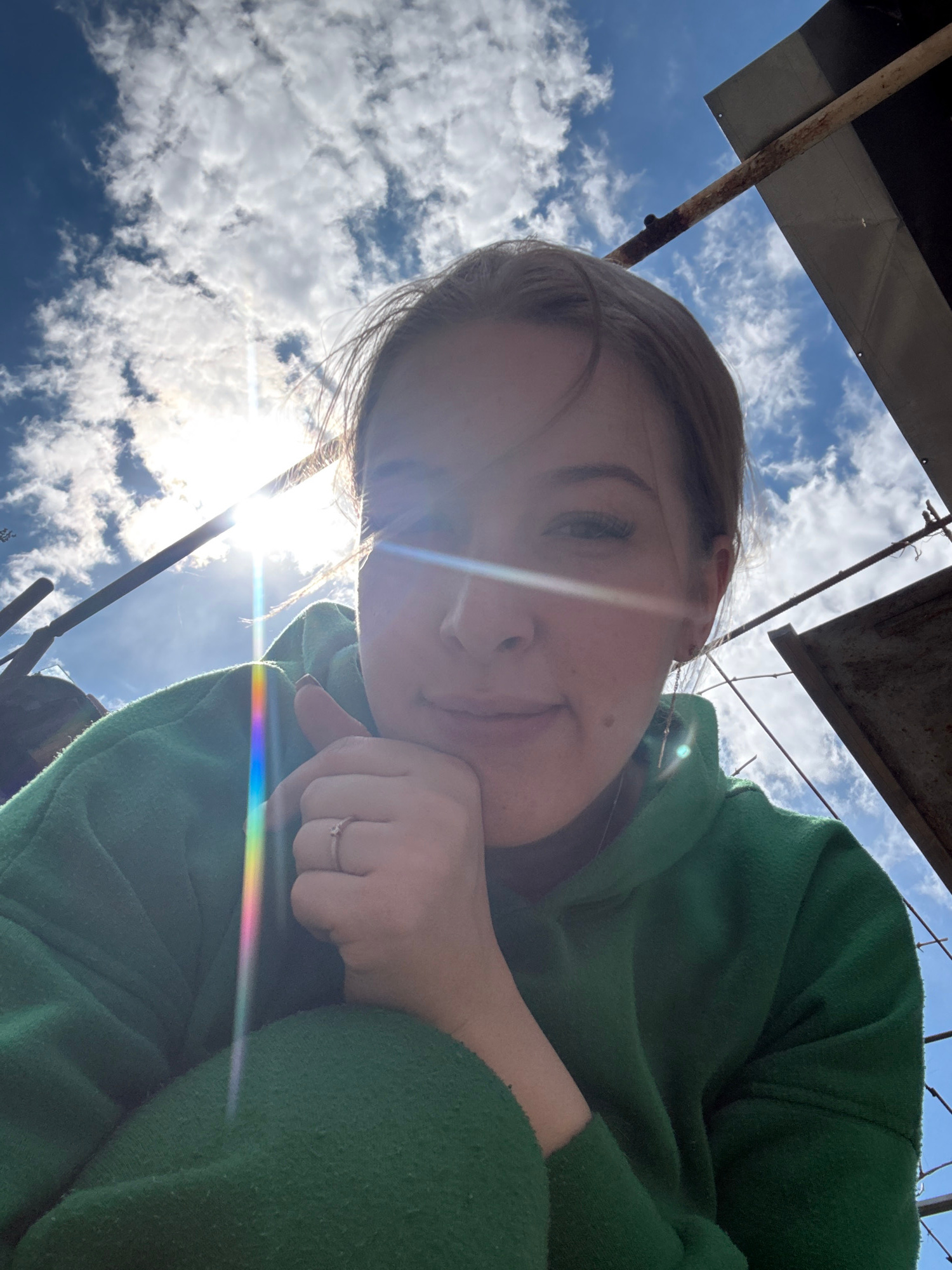 A low-angle selfie of a fair-skinned person with light brown hair, wearing a green hooded sweatshirt. Their right hand is positioned under their chin. The sky is visible with white clouds against a bl…read more